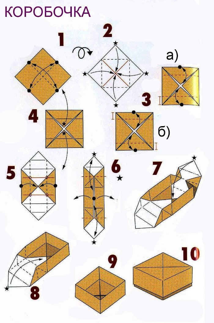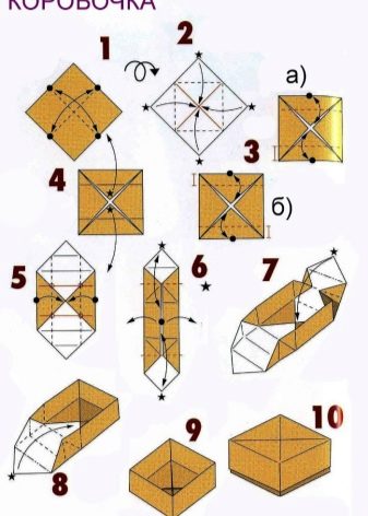 - Now look closely at the diagram: you need to perform two actions at the same time. Turn out the box from the inside and bend its edges to the center. It is quite difficult for a beginner, but you can handle it.
