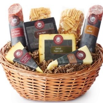 Usually, smoked meat and jerky come here. Keep track of shelf life. If you are not sure of the tastes of the person to whom you make the basket, you can replace the meat part with the sausage one. This is a more neutral option.