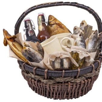 The basket, which is given on March 8, and I want to add a sprig of mimosa. And on your birthday, you can tie a bunch of multi-colored balloons to the basket handle. Do not forget to sign a postcard. By the way, in a basket with seafood, you can put a beautiful bottle with a cork, inside of which there will be a small note. These are words of congratulations that can be styled as the message of a cheerful pirate.