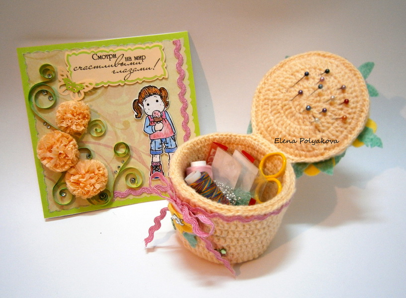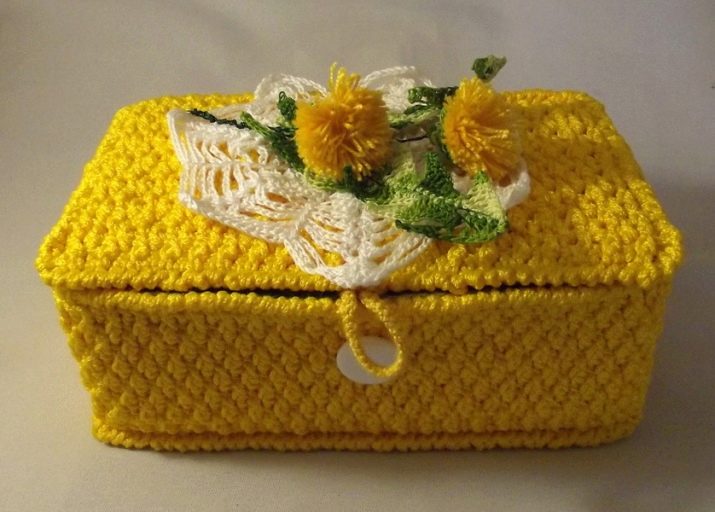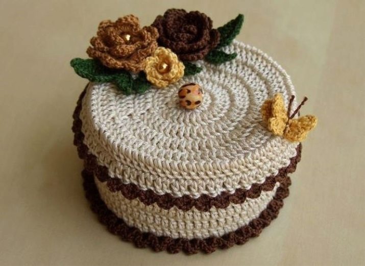 Such a thing is created on the same principle as the vase. It is possible to take a jar from under sour cream as a base and insert it inside the knitted product. Decorate the lid of the box with multicolored knitted flowers and leaves, adding beads to the decorations. Any woman will be happy for such an unusual gift.