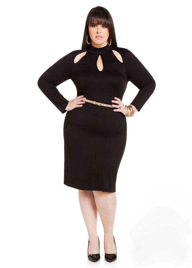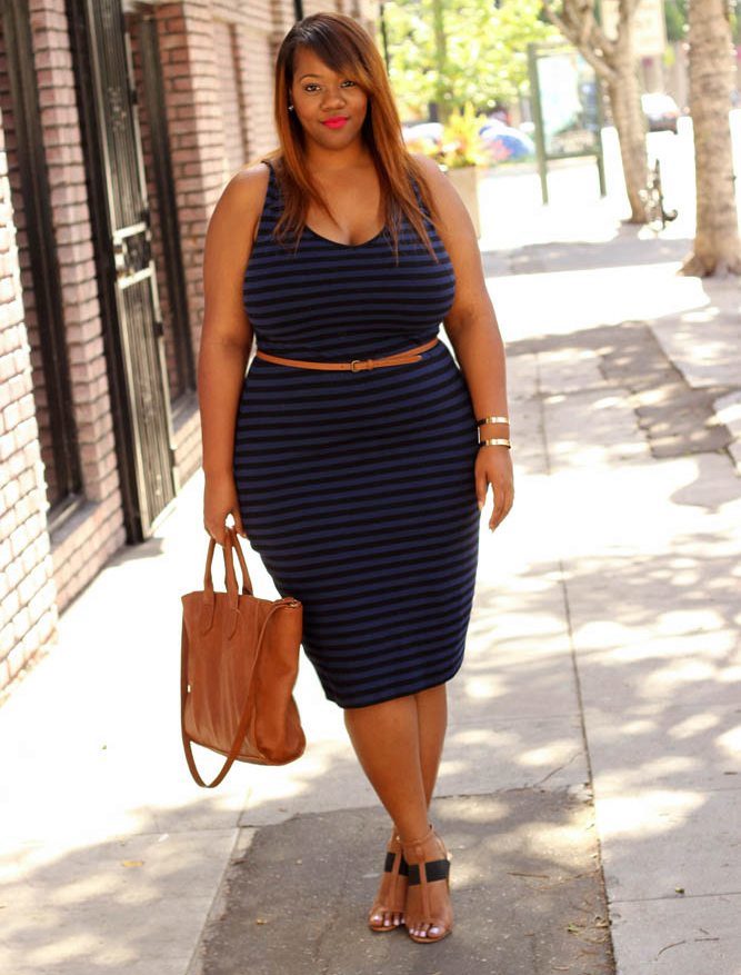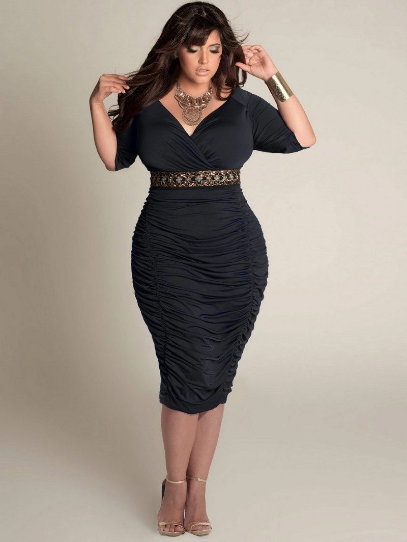 Sheath-dresses of large size can be found in almost any store where the presented sizes are not limited to L. Fat-bodied beauties are advised to pay attention to dresses made from dense, inelastic fabric. Models can be monophonic, combined or with a pattern. It is better to choose dresses with a large pattern and avoid horizontal lines.