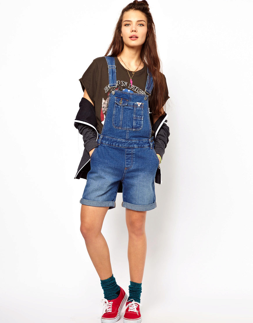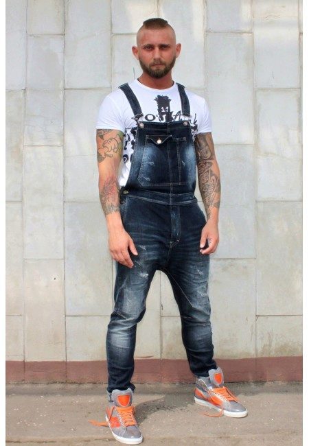 A bold and stylish image that attracts attention like a magnet. Dark blue denim bib overall with decorative scuffs blends perfectly with a white print vest. The highlight of the image - gray sneakers with bright inserts. Great for a summer day.