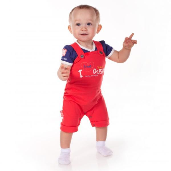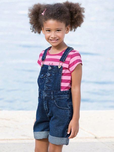 Traditional summer look for the little ones. Practical jeans perfectly combined with a pink T-shirt. Adjustable shoulder straps allow the baby to feel comfortable, and fashionable lapels on long shorts show that even children can be in trend.