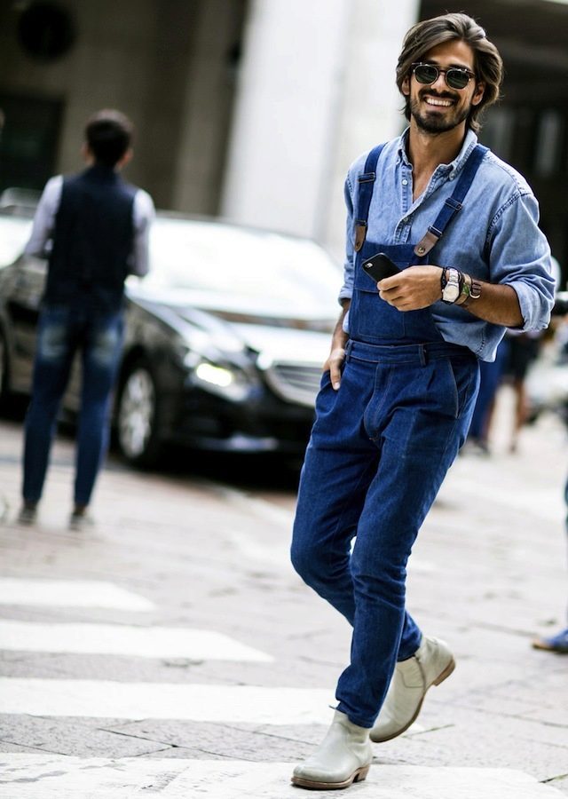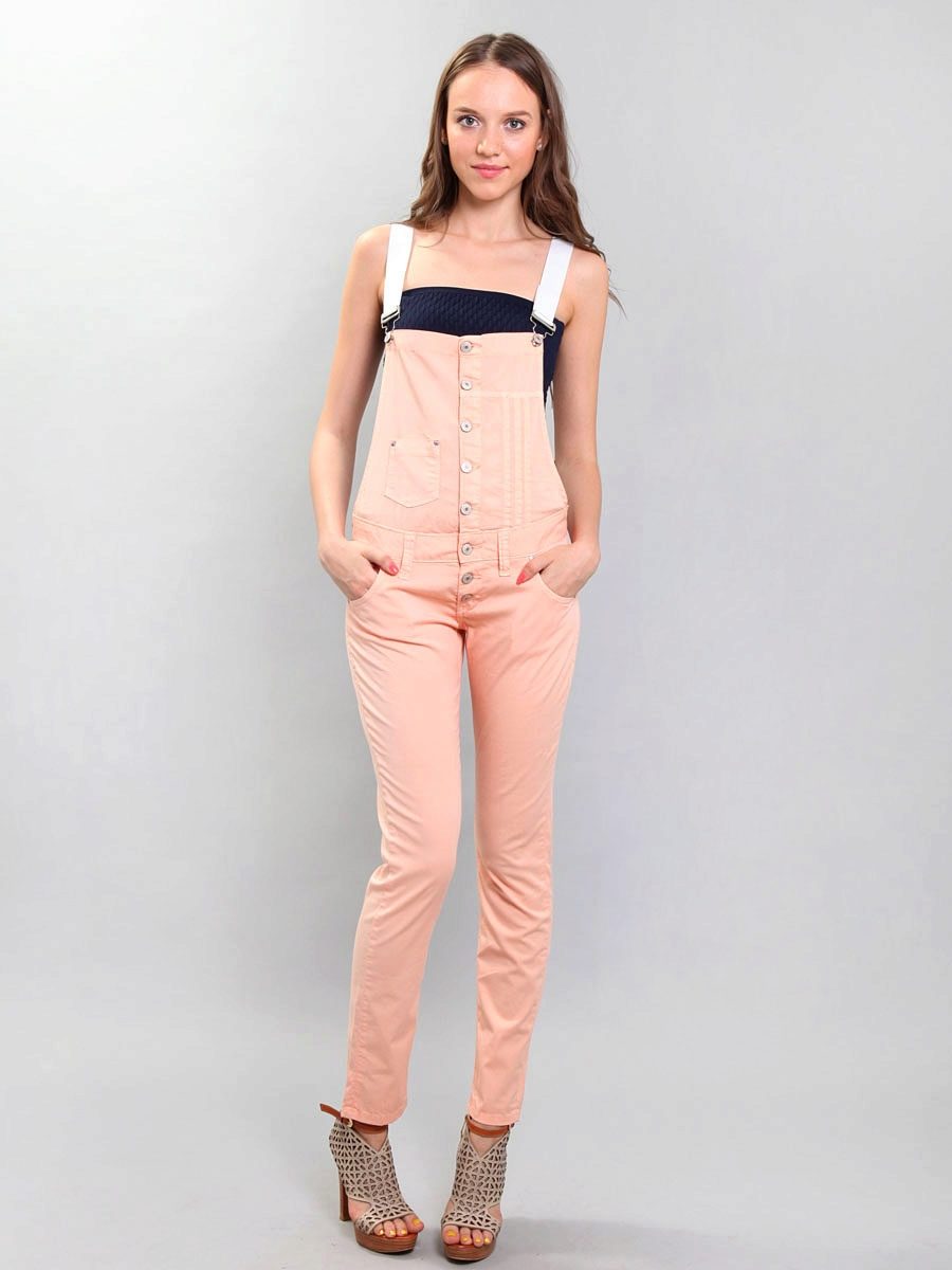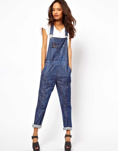 The semi-overalls are a type of overalls, where the upper part does not cover the shoulders and arms. Simply put, this is a one-piece suit, where the pants have a bib on the straps of different widths. In this semi-overalls can have not only long legs, but also variations: breeches, shorts.