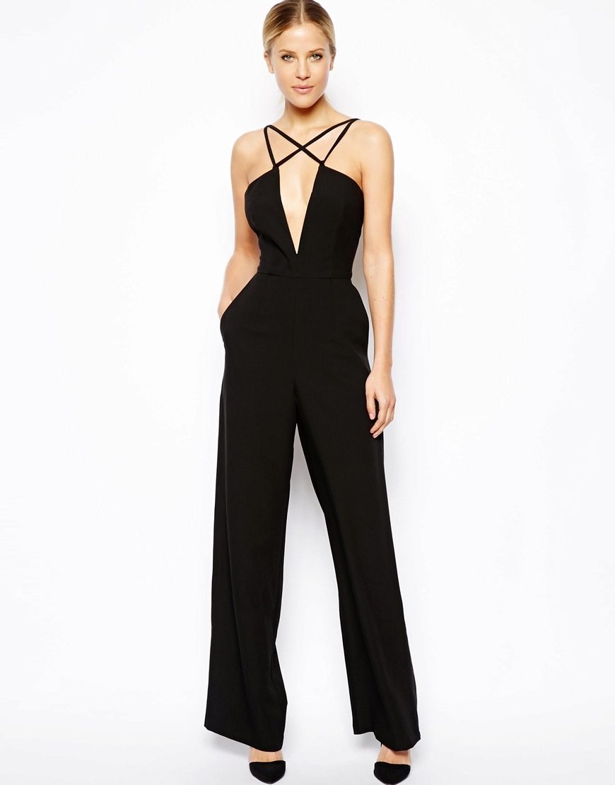 A luxurious evening look in total black style. Flared leg in the floor makes the figure feminine and slim, visually adding height and reducing kilograms. Seductive top with original straps draws attention to itself, completely forgiving the lack of jewelry. Outfit for self-confident lady.