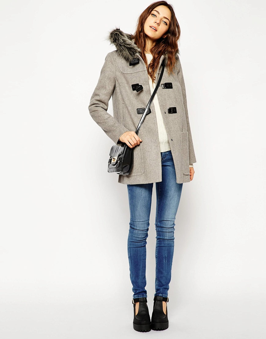 - This black pea coat is perfect for everyday wear. The fur on the hood gives elegance to the image. Stylish and comfortable look, which consists of a gray sweater, green skinny and boots with thick soles - this is the perfect solution for every day. The image is complemented by a black spacious bag and a black cap with a pompon.