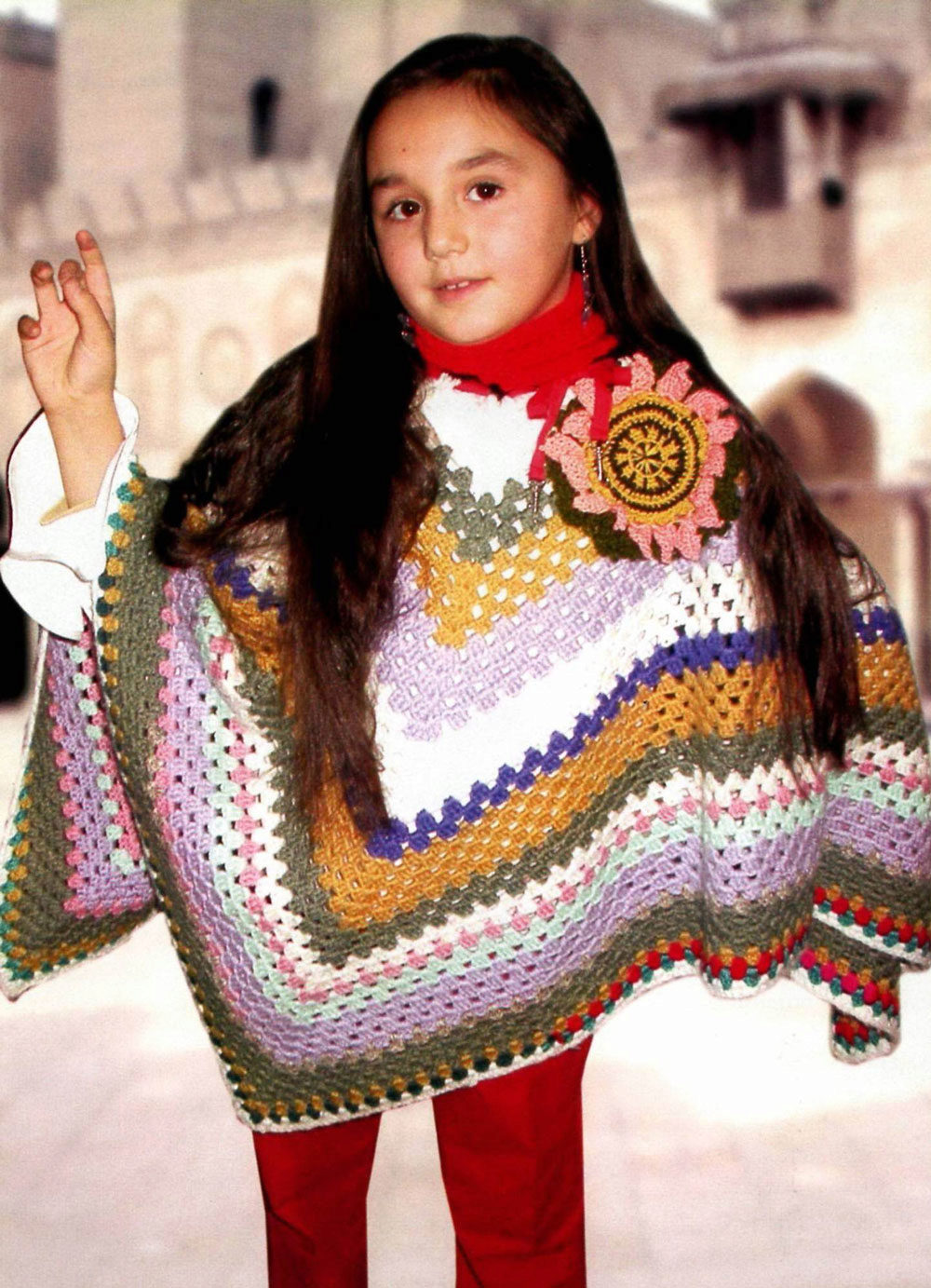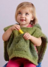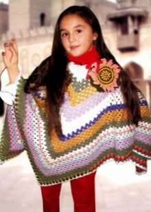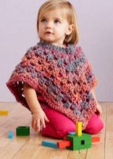 Popular rectangular option - a kind of sweater with a cutout for the head. Originally looks triangular poncho, as long as possible in the middle of the front and back. A charming option for little girls is a piece of motifs (sewn together separate fragments in the form of squares, circles, flowers, crocheted). Also on the babes cute looks poncho silhouette "bell".
