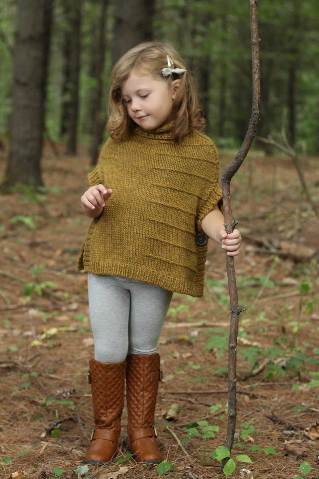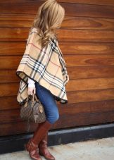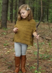 As already mentioned the poncho is a versatile piece of children's wardrobe, which does not cause problems in combination with other items of clothing. The girl can wear jeans or soft corduroy trousers under the poncho, shorts with tights look also harmoniously. Under elongated model leggings or leggings will be appropriate. For a more gentle look, choose a straight skirt made of thick material (for example, denim). Choose a turtleneck or pullover as the top.