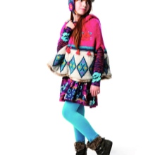 Bright poncho with a hood for a girl schoolgirl, which is useful as a demi-season clothing. Originality of things gives a triangular shape with a cheerful fringe in the form of pink pompons and, of course, a print in the form of multi-colored circles of different sizes, which looks especially impressive against a black background. Similar coloring to face to dark-haired dark-skinned girls. Corduroy pink pants echo in color with the fringe and print of outerwear, black patent leather shoes are also in place.