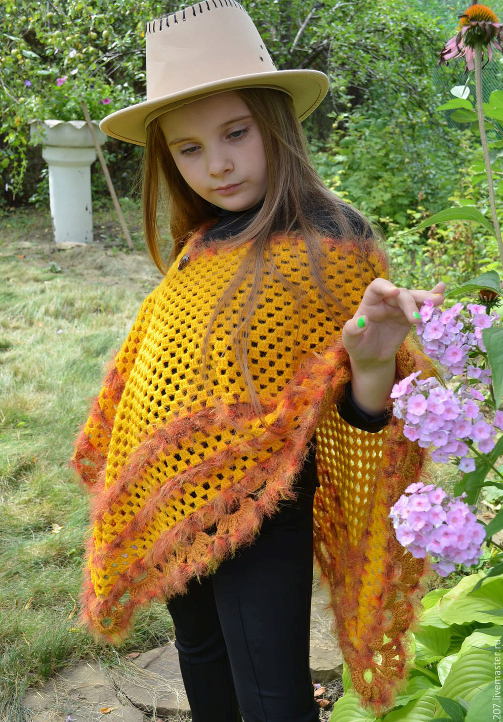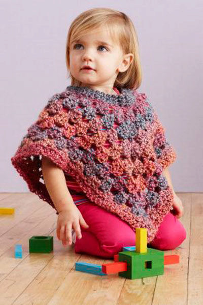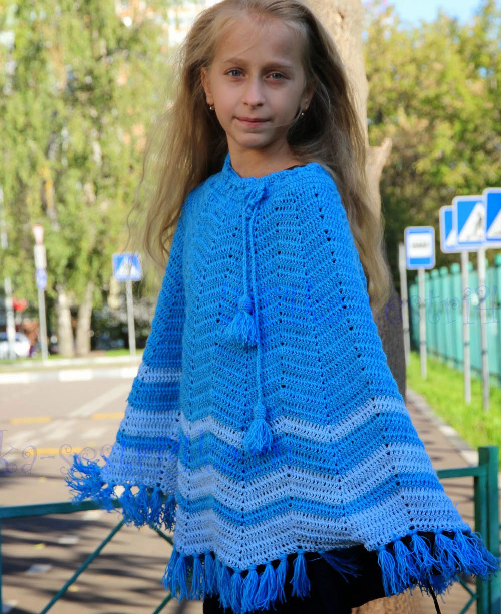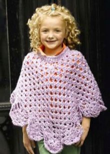 Crocheted poncho always looks elegant and is perfect for the spring-summer season. And decorated with an original braid, thin belt, applicative fragments, it will turn your little daughter into a real princess. Knitted poncho-cape with charming pigtails or an original “bump” pattern will decorate any girl.