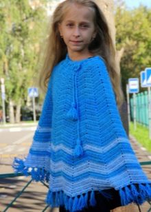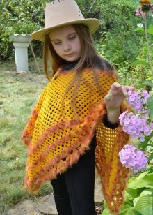 The festive option is a poncho-bolero, with which your daughter can wear over a fancy dress for a festive event (for example, a matinee in kindergarten). For girls of school age, the charming solution is a poncho-pelerine, which looks particularly impressive with fur trim. In addition, the most common children's poncho classic style, but openwork and made in white or light beige color, turns into festive clothing.