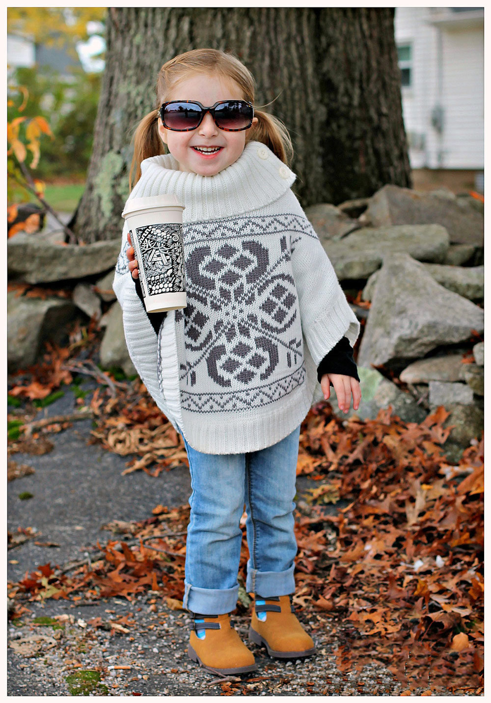 Poncho-woolen coat for a young fashionista. Such a stylish item of fashionable gray color will warm your little daughter on an autumn day. A neat hood and an original double buckle make the item especially cute. The rest of the wardrobe items are selected with taste: a soft pink turtleneck (gray plus pink is always a good combination), a long blue flared skirt with a delicate print. The decoration of the image is cozy white mittens with a pattern.