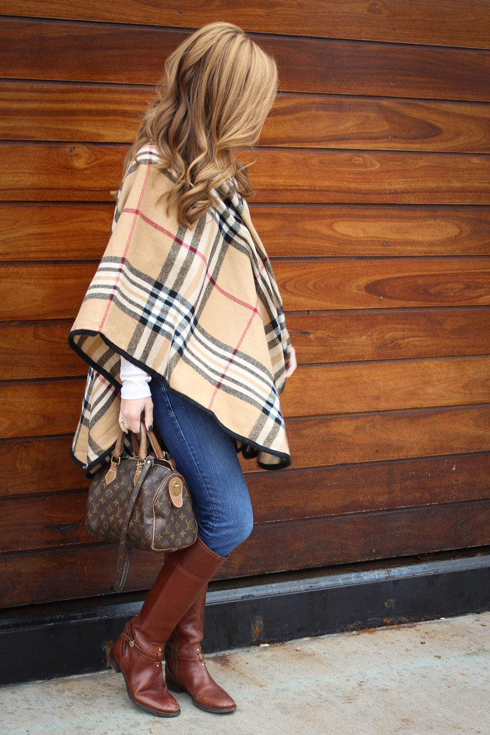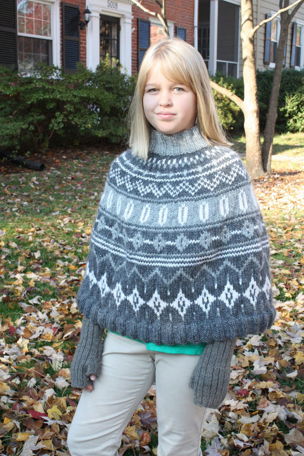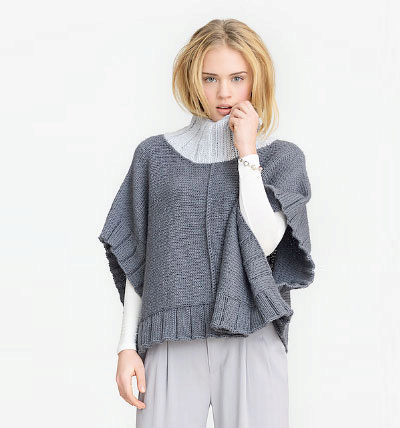Milky poncho sweater looks cozy and at home. The high collar, tied with an elastic band, beautifully fits the girl's neck, and the luxurious braids, knitted by raglan, look charming. The poncho has a short sleeve, opening a striped gray-white turtleneck. Short denim shorts over gray tights complement this trendy girl look.