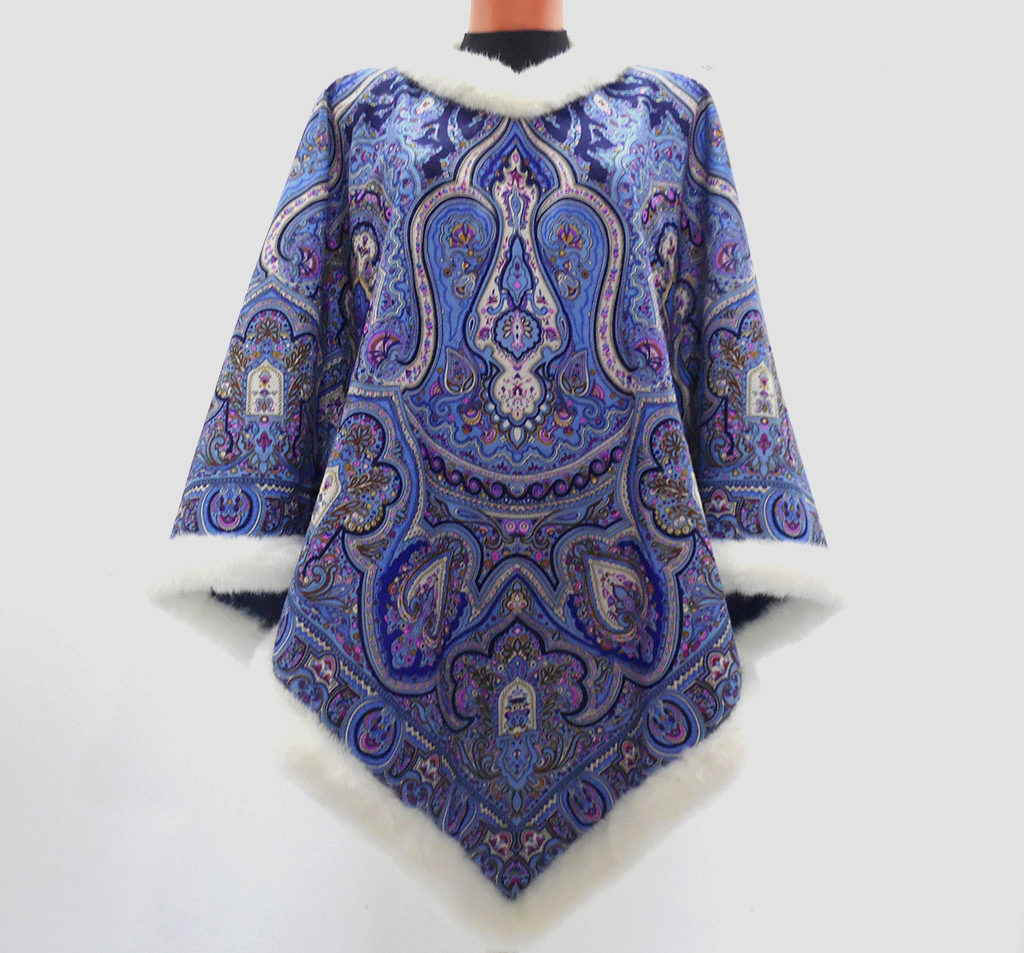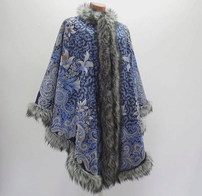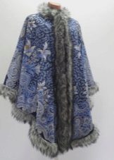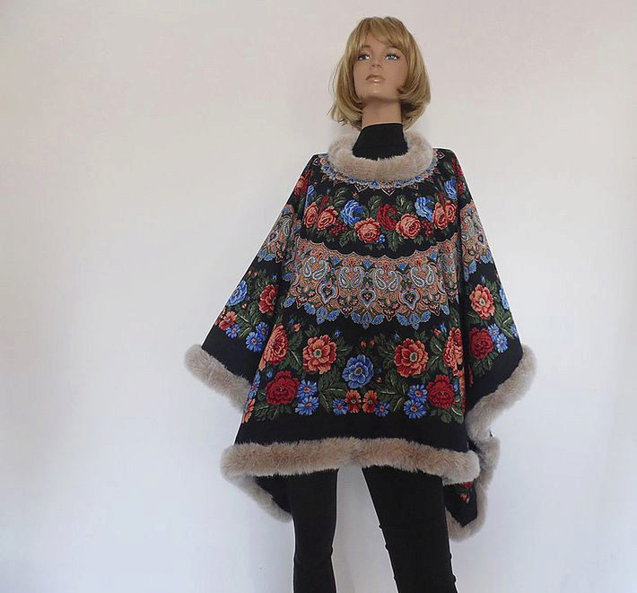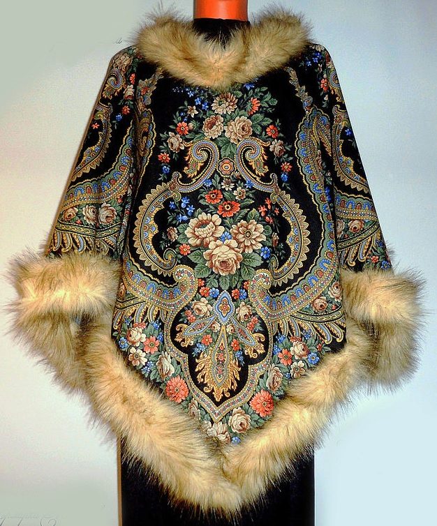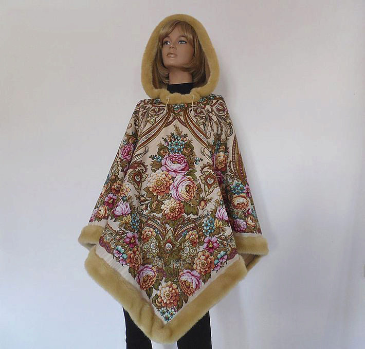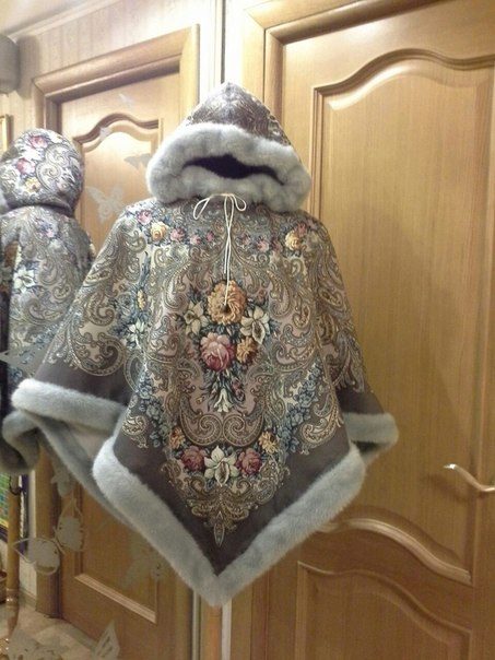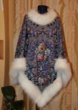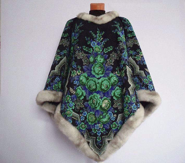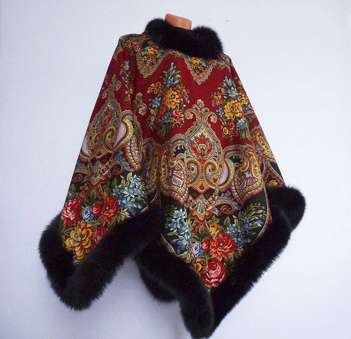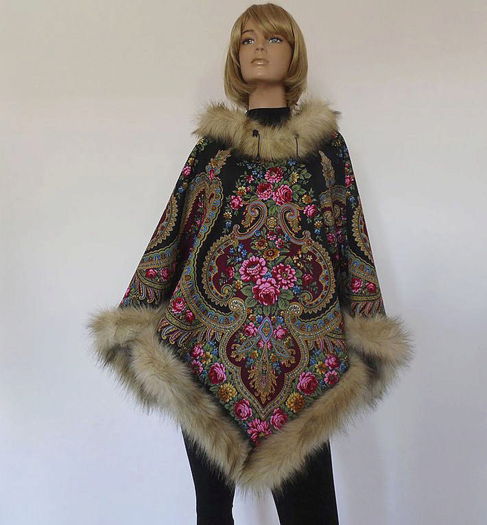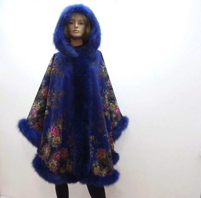But with Pavlovsky print, trimmed with fur, it looks just gorgeous. This is a stylish outerwear in the original Russian style. Natural fur with such a thing looks very noble (fox fur looks especially stylish), but sometimes it is replaced by artificial. Thus, women of this type can afford such a winter poncho with various means.