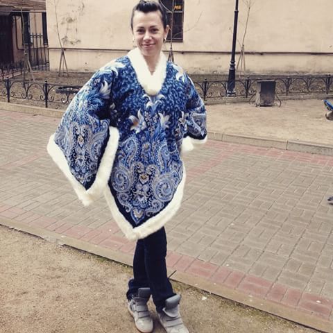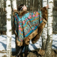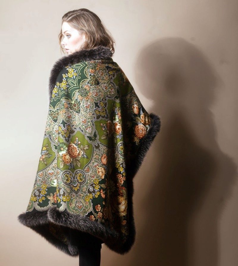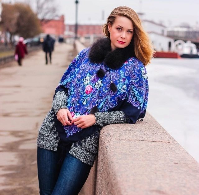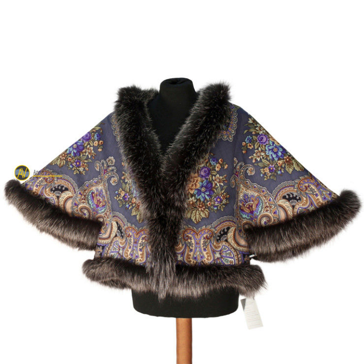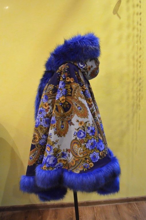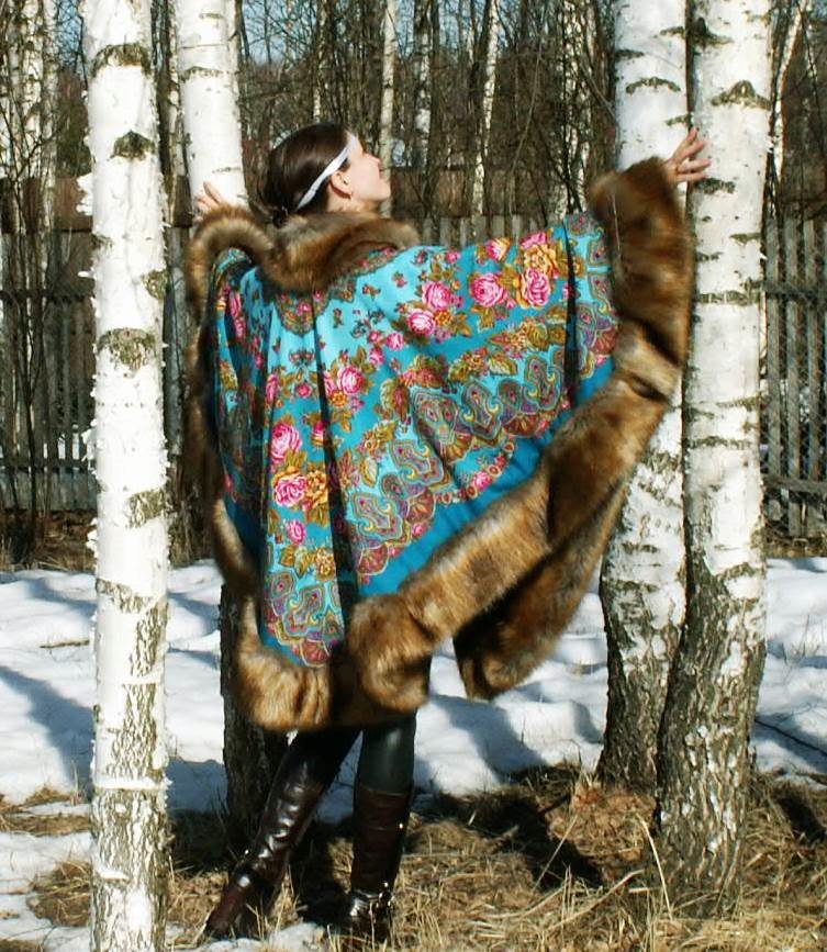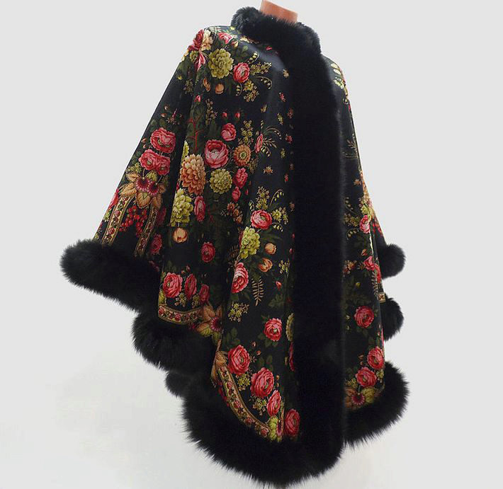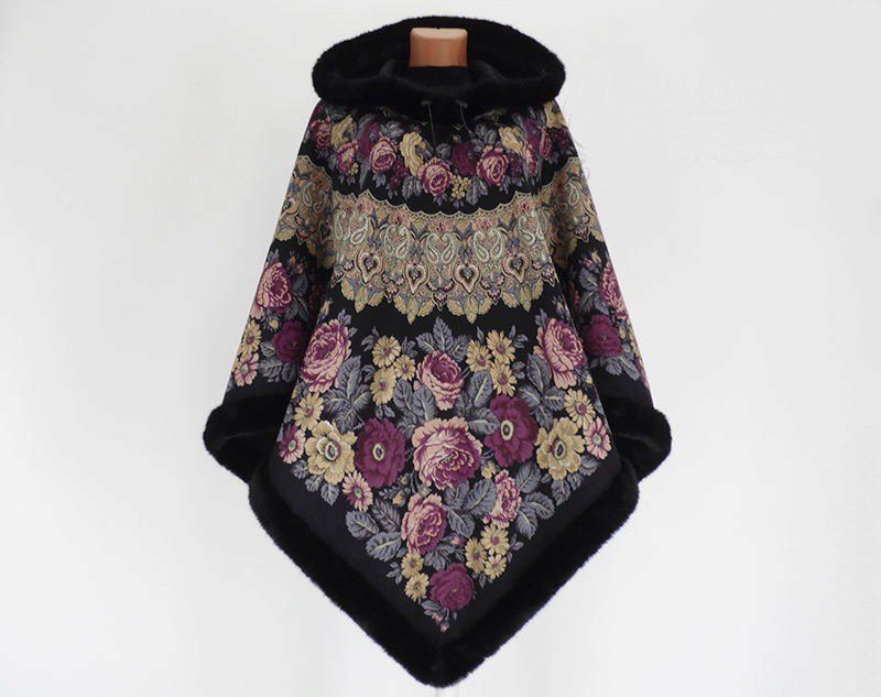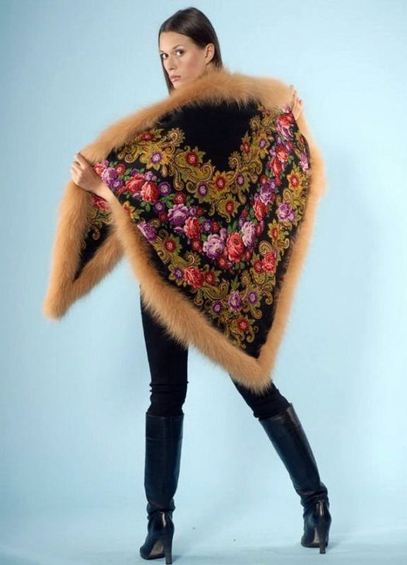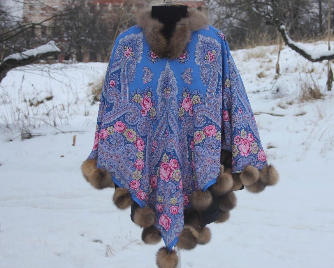 But with Pavlovsky print, trimmed with fur, it looks just gorgeous. This is a stylish outerwear in the original Russian style. Natural fur with such a thing looks very noble (fox fur looks especially stylish), but sometimes it is replaced by artificial. Thus, women of this type can afford such a winter poncho with various means.