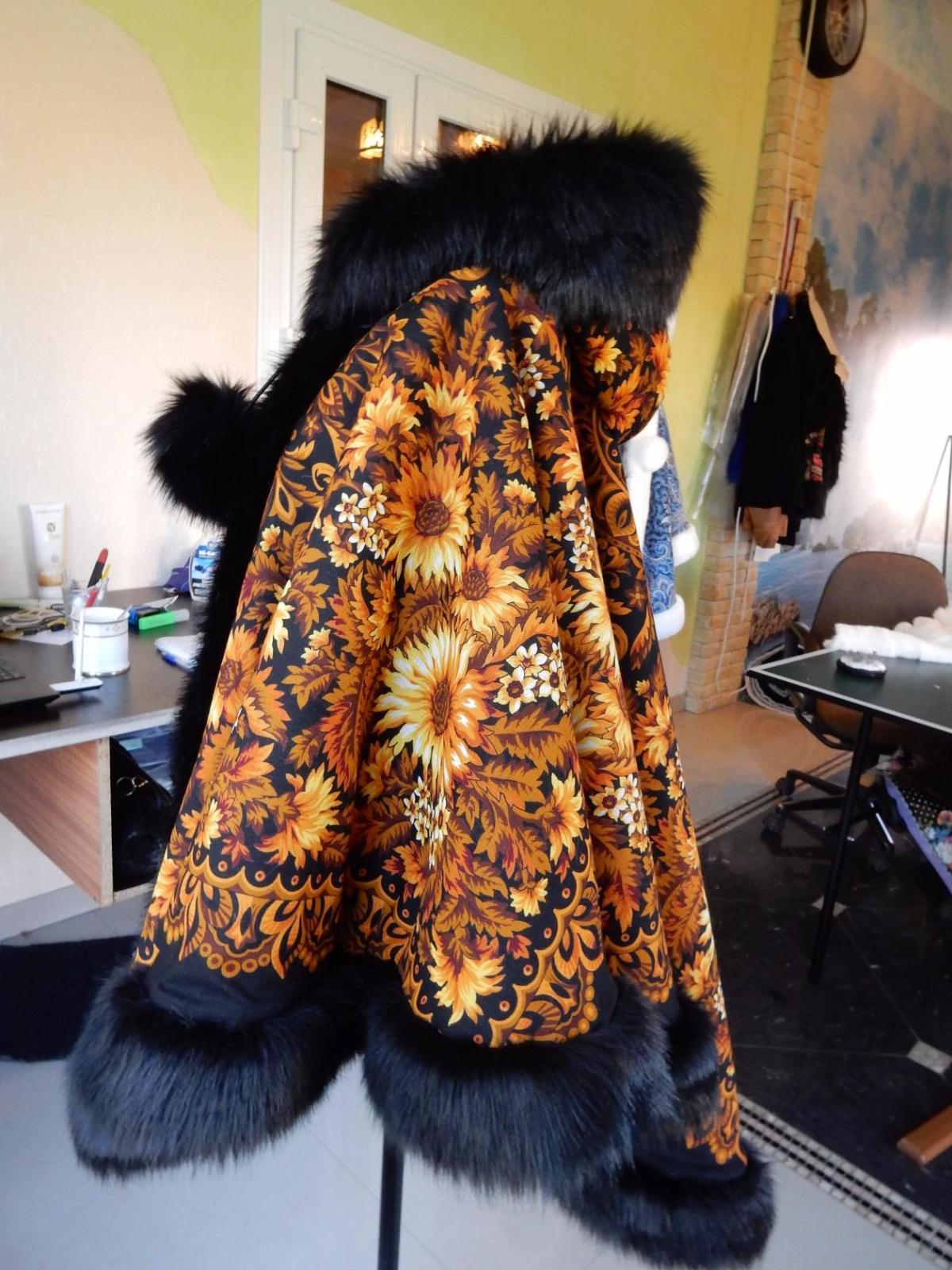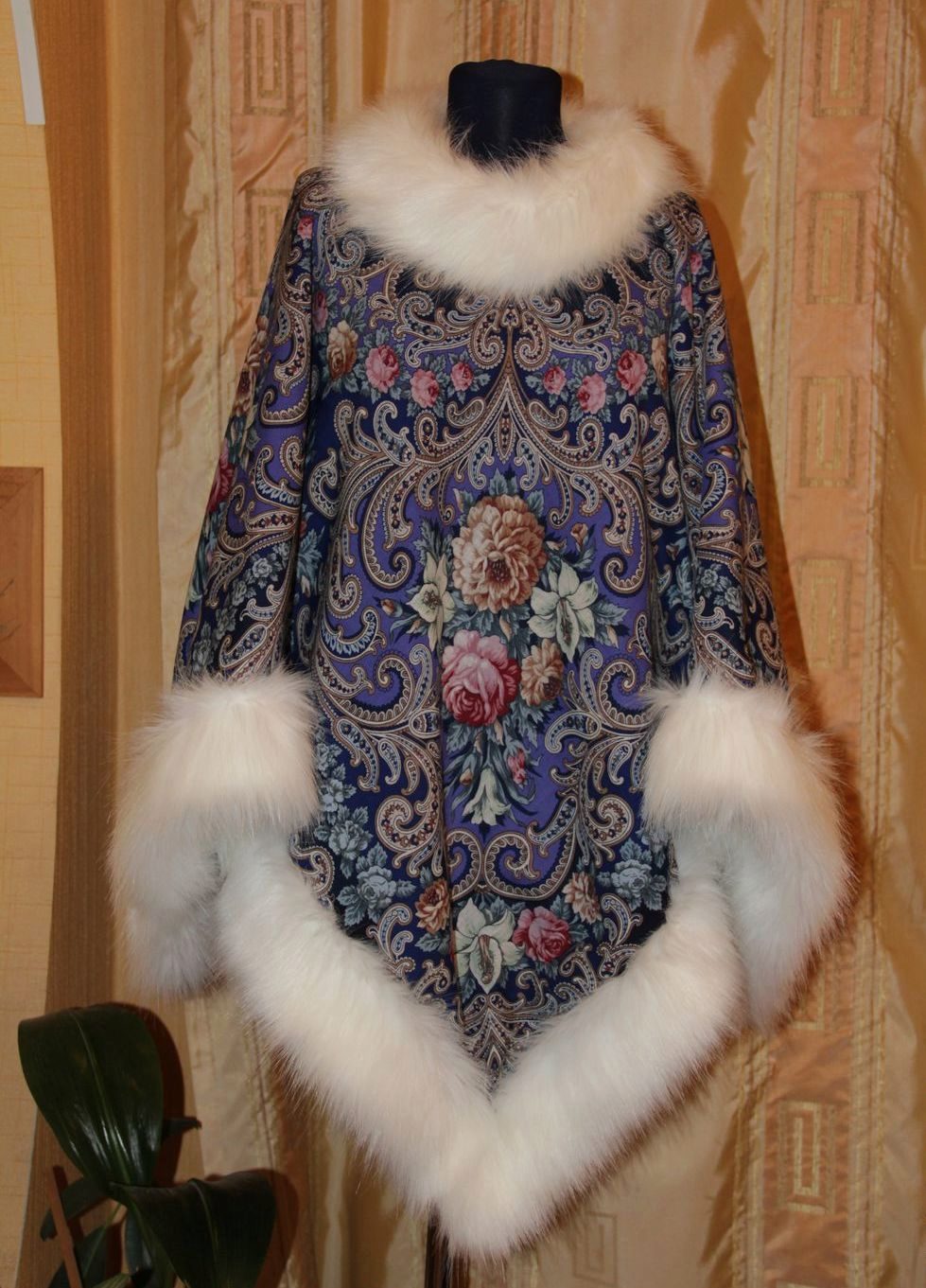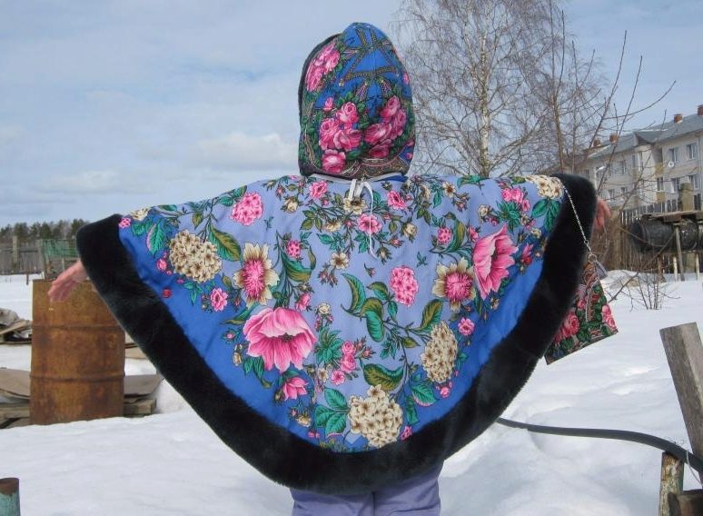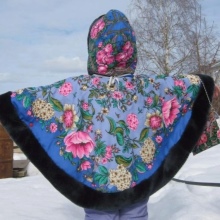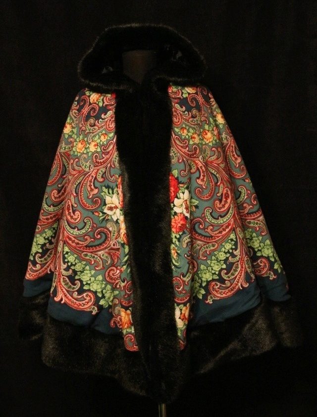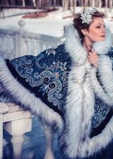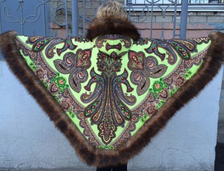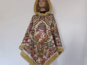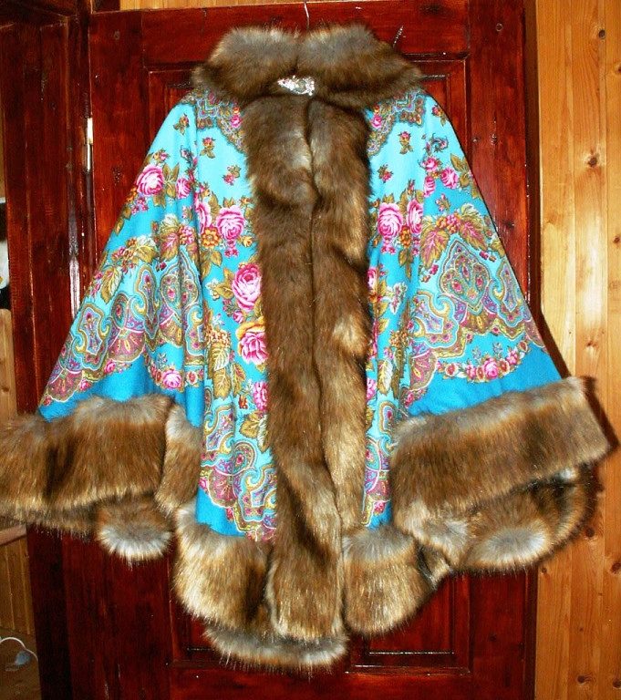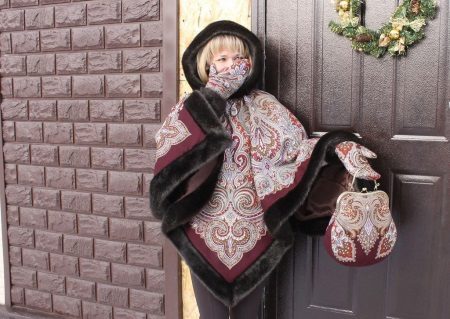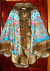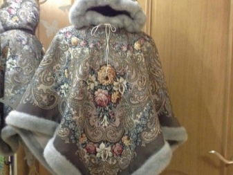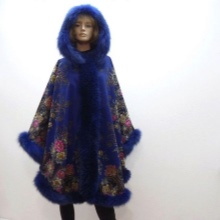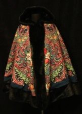 Insulated version with sleeves, hood, clasp is very useful for the winter season. Especially convenient is the shortened product for auto-lady. And the refined combination of Pavloposadsky scarf with fur trimming has been played up since ancient times.