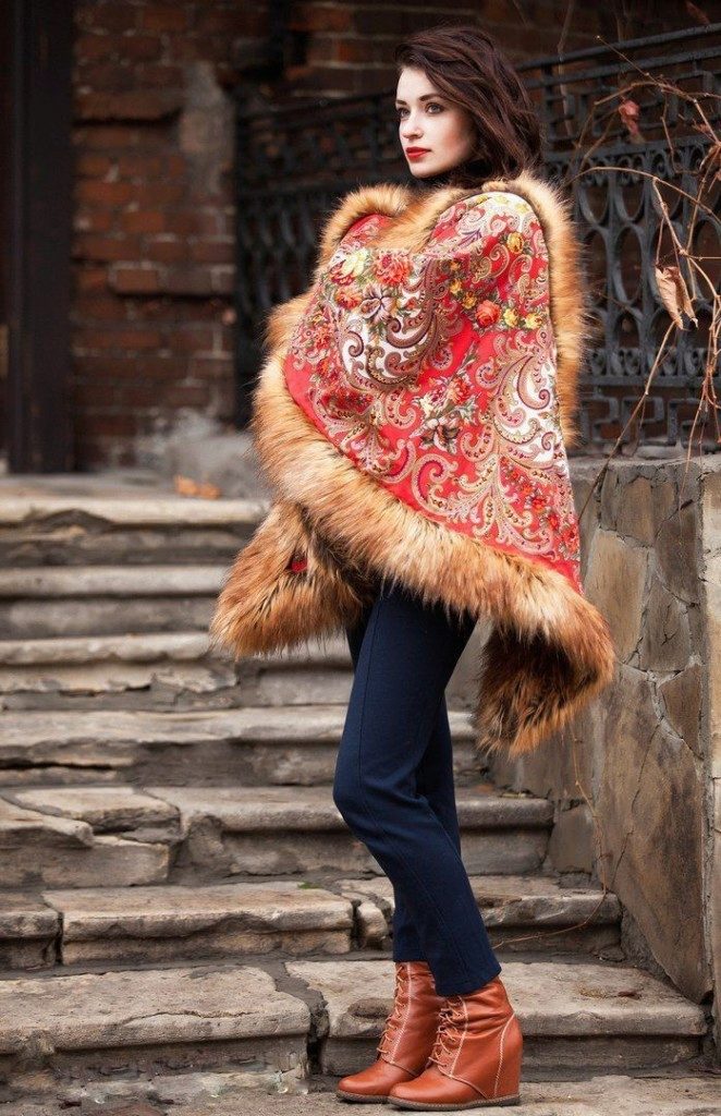 Another charming model with fur, which will choose a fashionista who wants to be the center of attention. Pavloposadsky ornament with a predominant red color - a sign of passion of nature (the same bright shade and lipstick of the girl). Red fox fox fur in a wide edging looks rich and defiant. Ankle boots on high wedge echo in color with fur. And cropped, narrowed trousers in blue color emphasize ponchos.