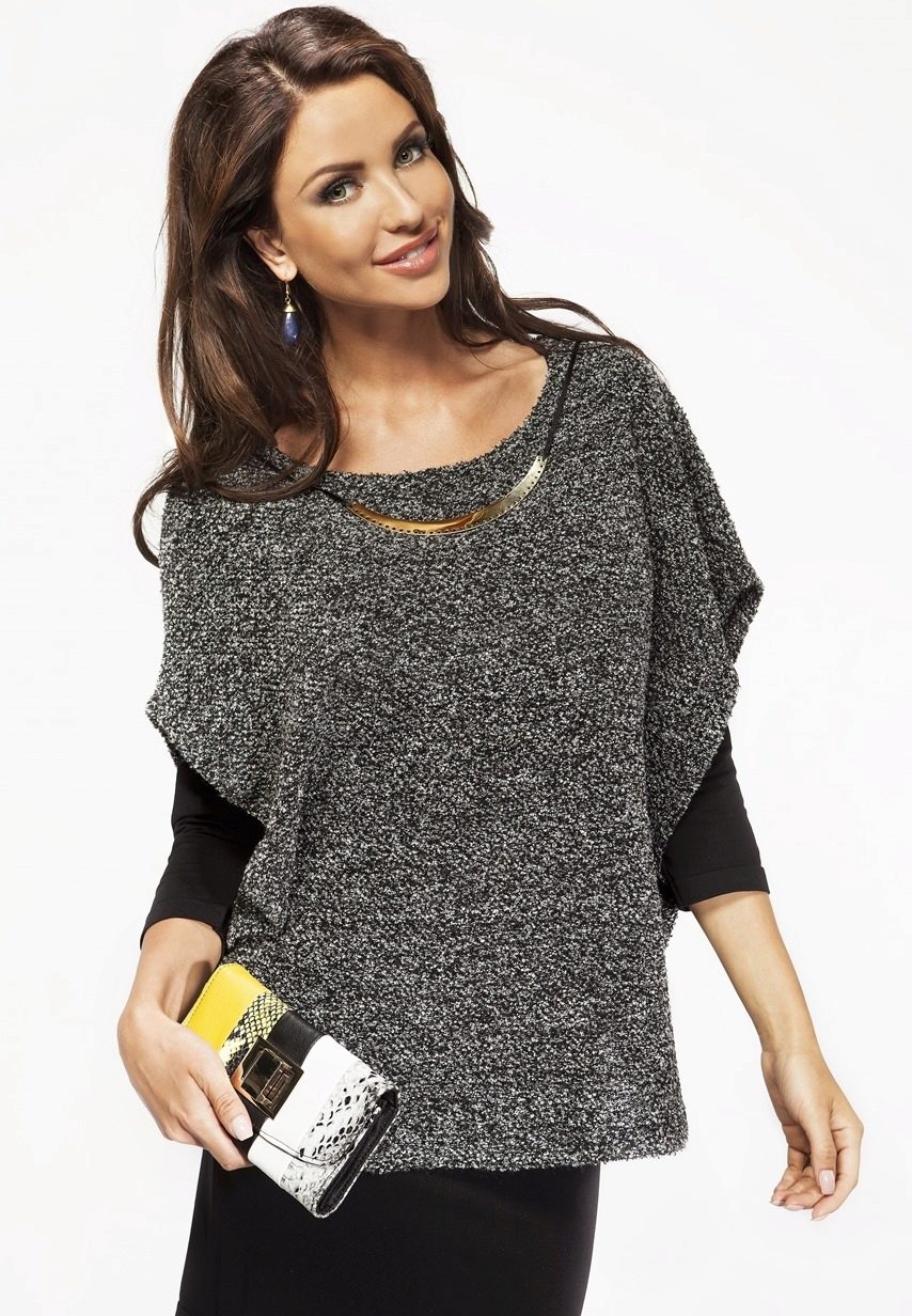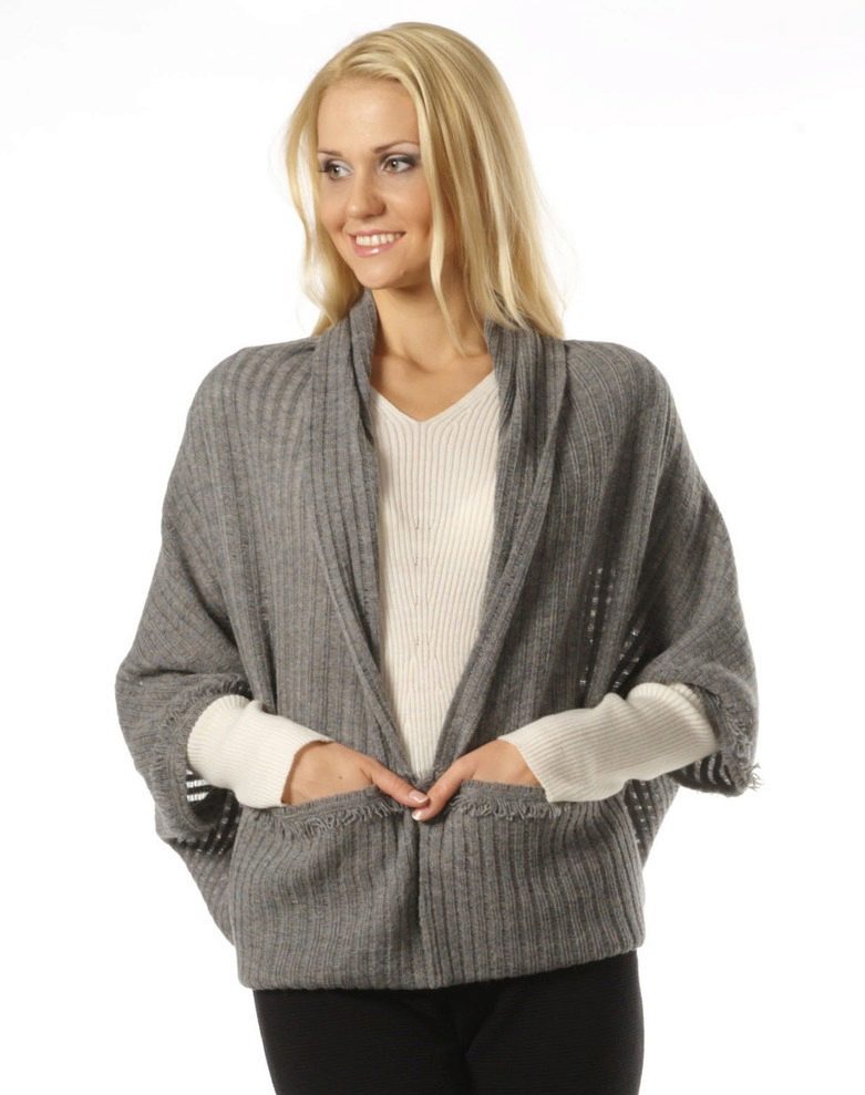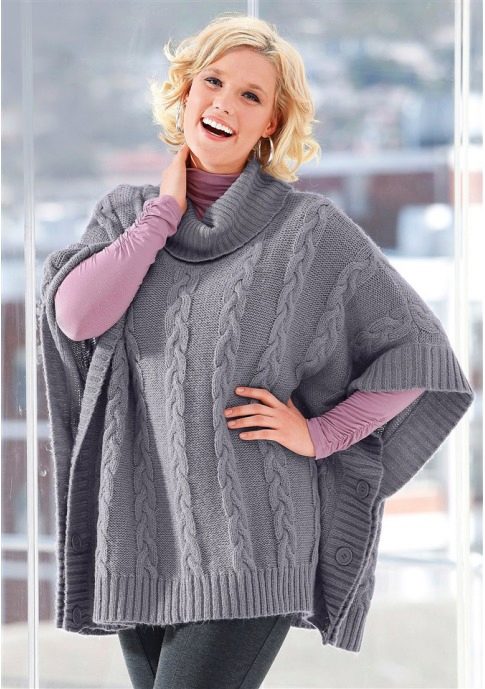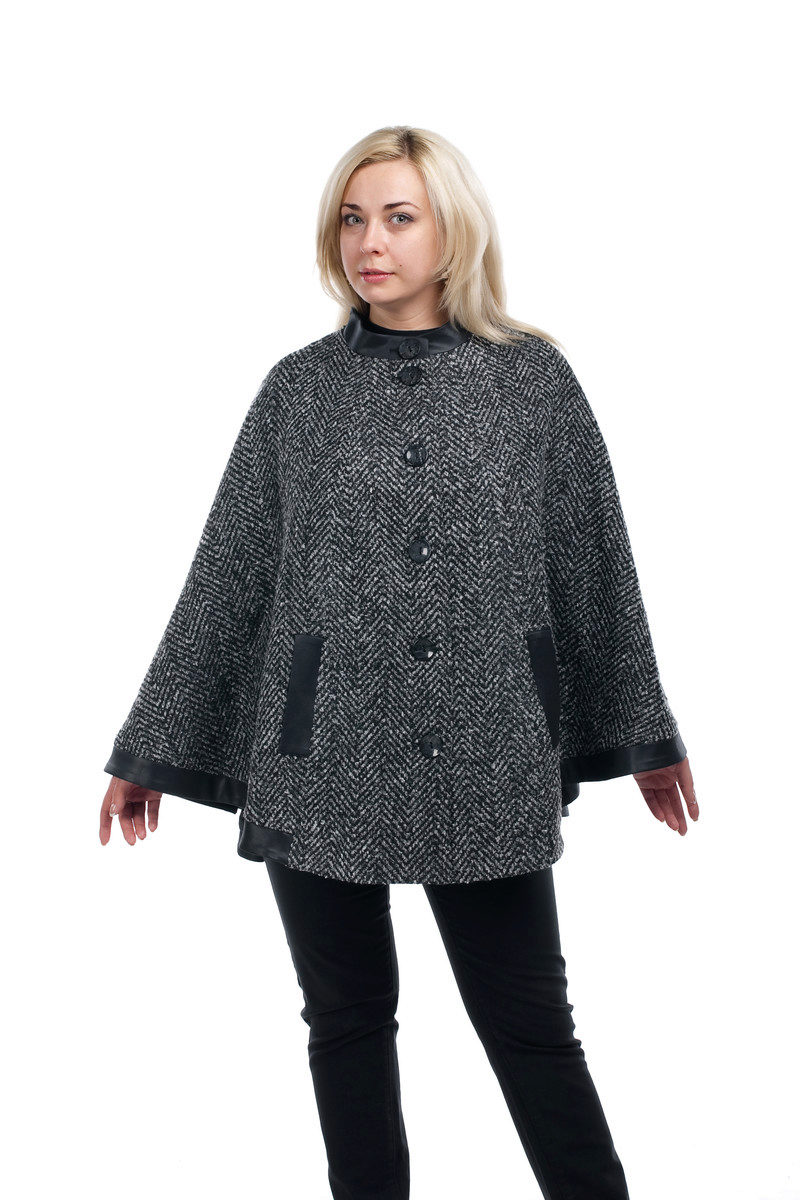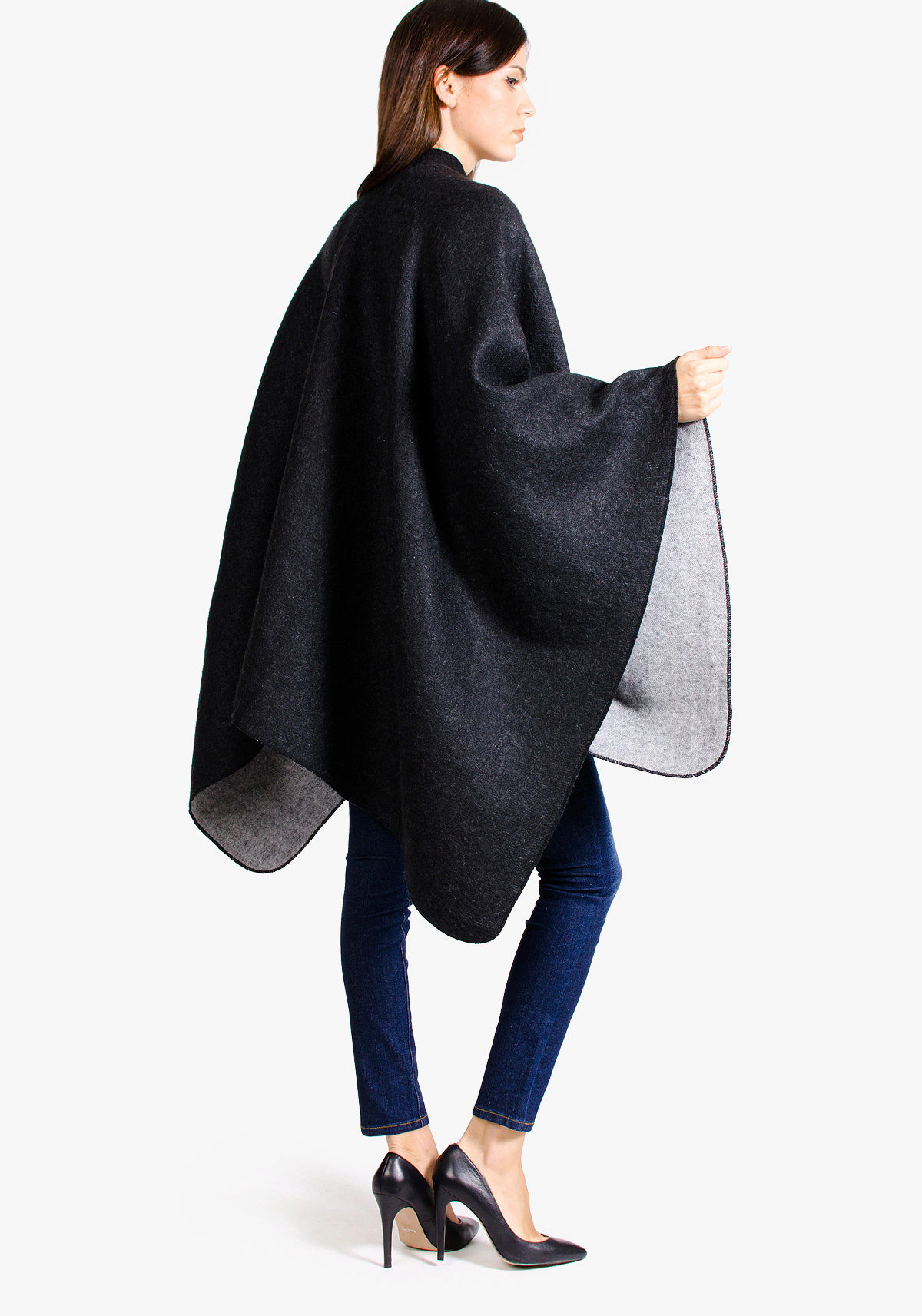 - A more restrained and elegant look has a double-sided oversized poncho-cape. Thanks to the free style, the product is very cozy and warm, the light gray side will allow to slightly dilute the dark shades of the image, and the dark one will be more practical and less branded.