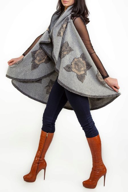 - A gray poncho made of thick mohair material looks rather interesting and unusual. The product is decorated with a border of a couple of tones of darker, as well as large flowers. The combination with jeans, a translucent turtleneck and mustard-colored boots with high heels will look fresh and diversify your everyday wardrobe.