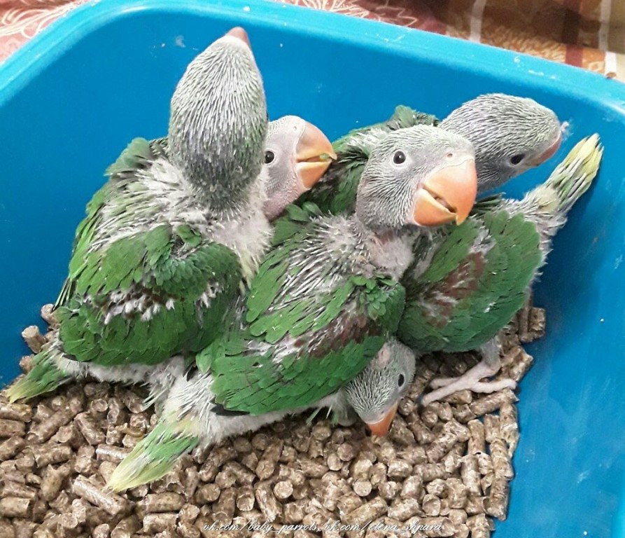 A pair can incubate two, three or four eggs. After the chicks appear, the parents feed them for almost two months, then the babies become independent. So, it's time to transplant the young into another cage.