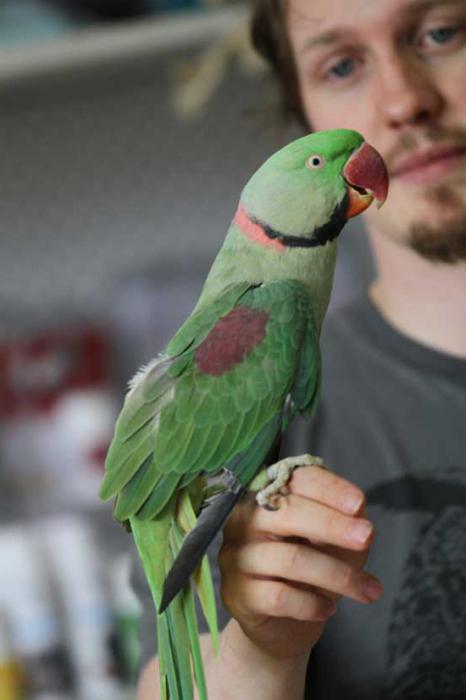 When a parrot gets used to a person, he sits on his head, constantly talks, eats from his hands and tries to attract attention to himself in every way.