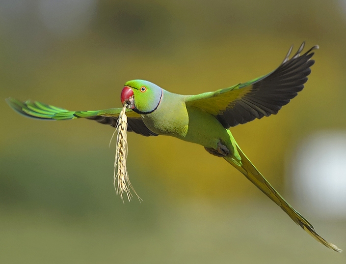 For comparison, the yellow-colored parrot buds can be noted; this species is called lutiny.They differ from the Alexandrian ones not only in the color of the plumage, but also in the necklace, which has a white tint.