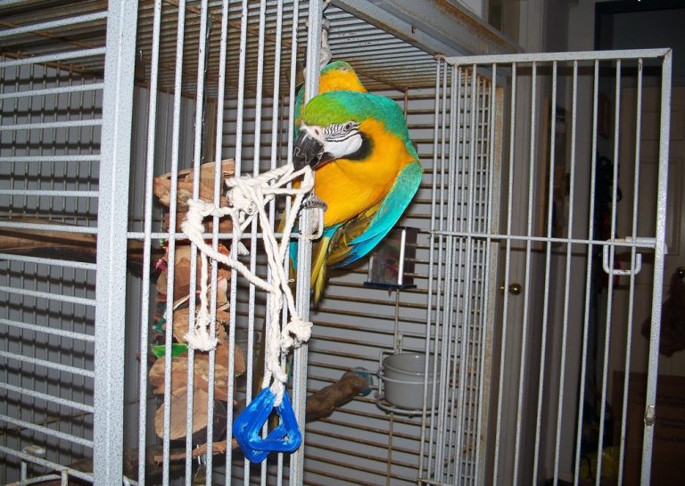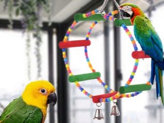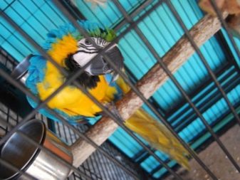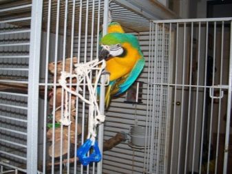 Keep in mind that the macaw likes to hang upside down, so place toys and vertical structures should be higher, so that the bird does not hit the bottom of the enclosure. Do not forget that these parrots are great lovers of water procedures, therefore a small bath should be installed in the cage.