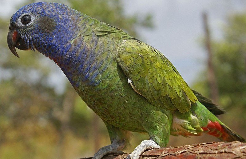 - Blue-throated. A parrot with an iris of a light yellow color, the cheeks are rather small, almost bare, covered with very thin feathers of blue color. The beak is very large, black. The paws are dark gray, the tail is elongated, at the end there is a pronounced narrowing. Feathers on the forehead of a rich blue tint. The same color is present in the plumage of the neck and throat of the bird.