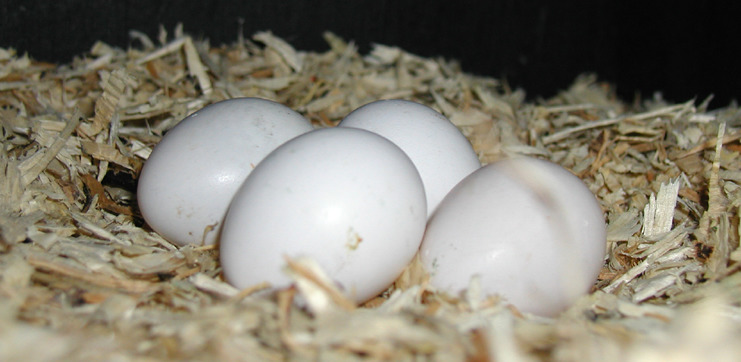 3-4 weeks after mating, the female lays the first egg, then all subsequent ones with an interval of 3 days. As a rule, there are 2-3 eggs in the clutch.. Immediately after the appearance of the first of these, the female moves to the nesting house and begins to hatch them. At this time, the provision of her food takes on the future father, who is all the time nearby and brings the grain in his beak.