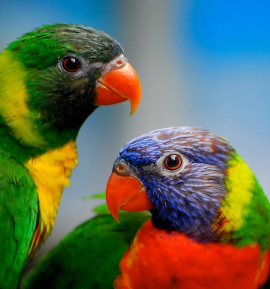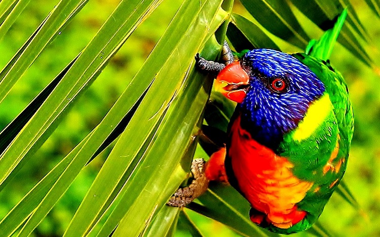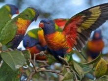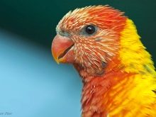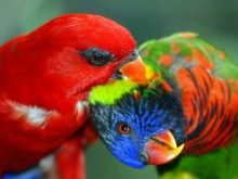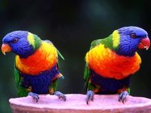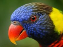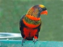 The name Rainbow Lorikeet speaks for itself. In the coloring there are red, yellow, green and blue colors, there are black feathers. This species is often kept at home. It is interesting to see the brilliant lory and especially distinguish the cardinal from the lory. The bright red plumage has an unusually beautiful play.