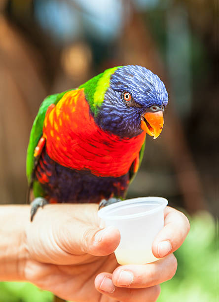 - Lory parrot will love fresh juicy fruits, such as grapes, oranges, apples, pears, bananas, you can give grated carrots. Since Lori needs to be fed with liquid food, and he loves sweets, he is happy to eat cereals with sugar or honey, he will like children's fruit food. Dry food, consisting of cereals, rarely and in small quantities. It is always necessary to control that there is clean water in the drinker. Fruit bird juice also will not refuse.