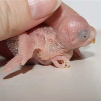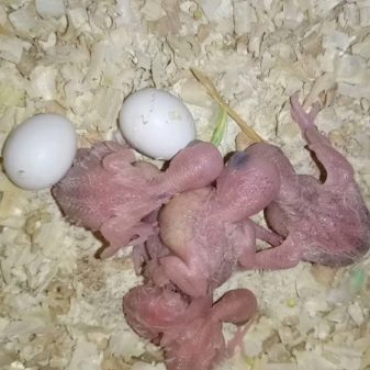 After the female pulls the eggs, she incubates them for 17 to 30 days. All this time, the male is next to the female and brings her food. After this difficult period, blind chicks of parrots with fuzz hatch. Worth mentioning that the female blows one egg a day, and later the chicks also hatch in that order.