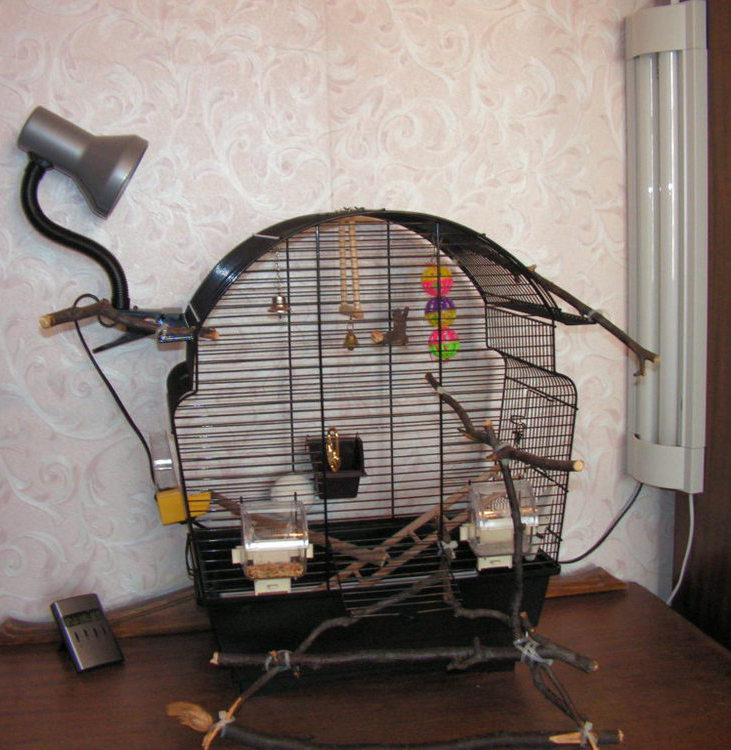 The optimum temperature for breeding birds is from 20 to 24 degrees. Humidity must be high - 70%.. To create such conditions, it is necessary to additionally purchase a lamp, put sponges with water in the cage, and, of course, purchase a thermometer with a hygrometer. Of course, the cage itself should be spacious for birds. They must move freely on it, without the risk of injury to the wings on the rods.