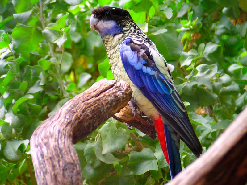 - The motley rosella is divided into three subspecies, which can be found in Tasmania and in the south-east of Australia. The size of the bird is relatively small (length is not more than 0.32 m, wing - up to 0.11 m). The bird is distinguished by graceful plumage. Top feathers on the back are black, but each has a yellow-green border. The same yellow-green color is characteristic of the lower part of the back as a whole. Bright red neck and chest look very attractive.