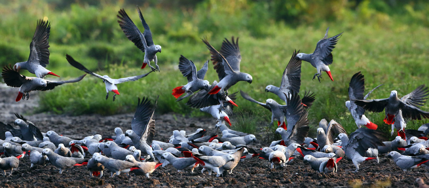 One of the most attractive species for humans in the dense forests of West Africa is the jaco or gray parrot. Medium-sized birds with ash-gray plumage and a bright red even tail, have a body up to 35 cm long and a wingspan of about 65 cm. Collecting in small flocks, they live on tall mangrove trees on which they nest and sleep. They feed on the fruits of oil palm, fruits, and greens; they can also eat a snail. Gathering in large flocks, parrots cause damage to agricultural plantations, for which they are caught for sale and meat.