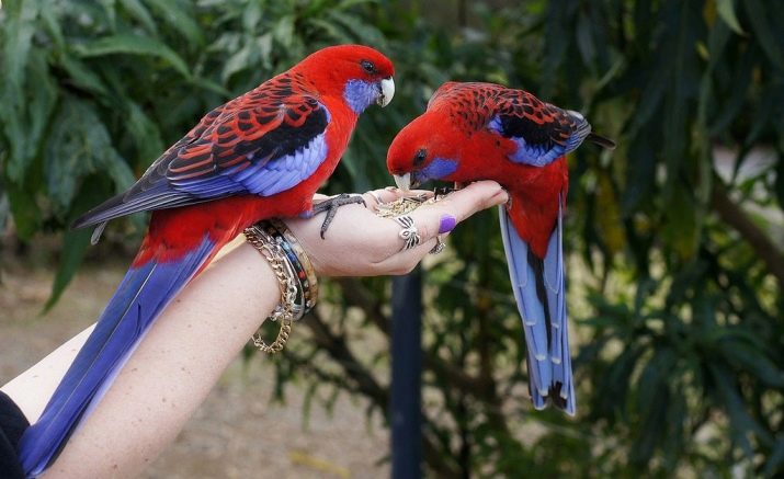 This type of parrot is gaining popularity recently.Roselles are characterized by a bright contrasting color, the combination of colors in the plumage of this parrot can be anything. Often there are blue-red, red-yellow, yellow-blue colors, plumage on the back of the rosella resembles scales. They are slightly larger than a wavy parrot, have a wayward character, high imitative abilities, and have a strong beak that can gnaw through wires.