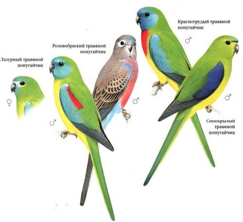 In total there are 7 species of grass parrots, each of which has its own unique color. Let us examine in more detail each of these species.