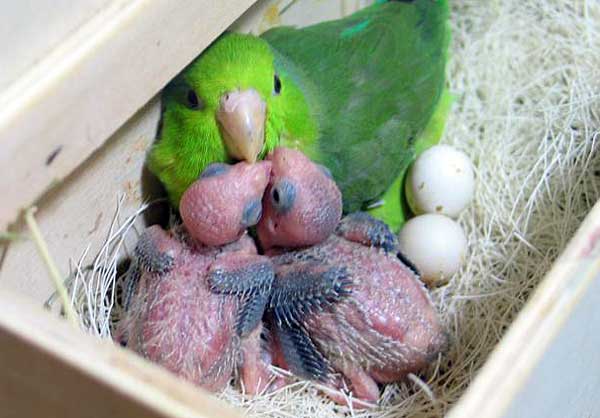 The cage of any feathered should be clean, and the feeders with drinkers almost sterile. After the birth of the baby, this rule does not change, but the nest itself can be cleaned 2 weeks after the birds hatch. To do this, it is thoroughly cleaned of all the accumulated debris and adhering dirt - at this moment newborn parrots are moved to a specially prepared box with insulation. Keep in mind that hygiene measures should be carried out as quickly as possible, otherwise chilling chicks may be.