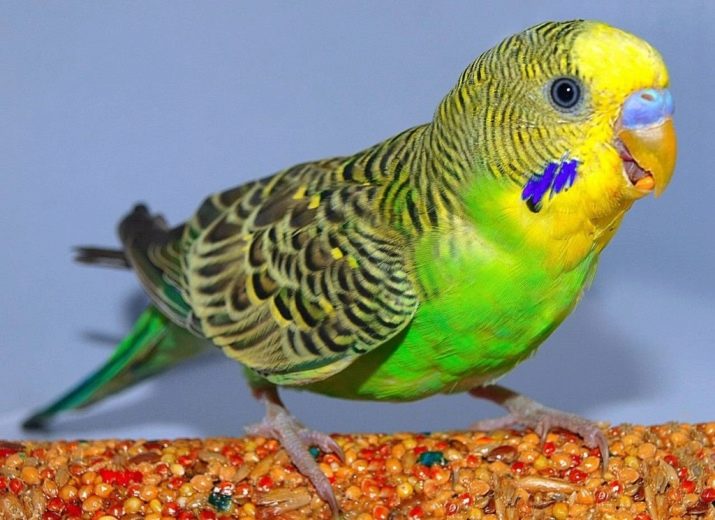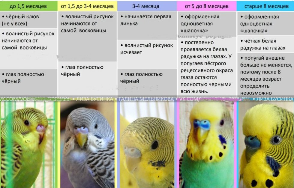 Before the first molt, the head of the chick is decorated with dark stains, then they are replaced by a monochromatic “cap”. By six months, the chick can already boast of an adult bright color, he has a mask characteristic of a wavy parrot. In older individuals, the coloration color fades, and feathers almost disappear around the eyes.