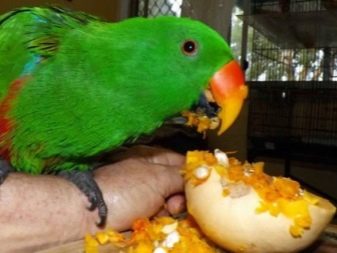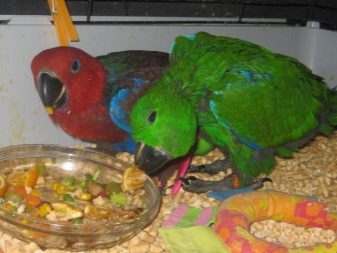 They eat often, mostly food should consist of vegetables, fruits, berries, excluding avocado - this fruit can even cause death. Experts recommend very rarely feeding eclectuses with lean meat - in small quantities, since in nature birds eat a large number of insects, this can serve as a certain kind of compensation. Little parrots are fed with a spoon or syringe.