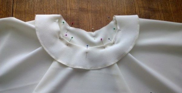 - fix the facing on the neck of the top of the dress with pins, aligning the tags. At the same time, the edge of the neck should be larger than the facing;