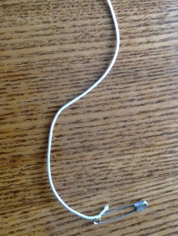 - Trying on the dress, attach the open end of the jumper under the right edge of the neck of the back.