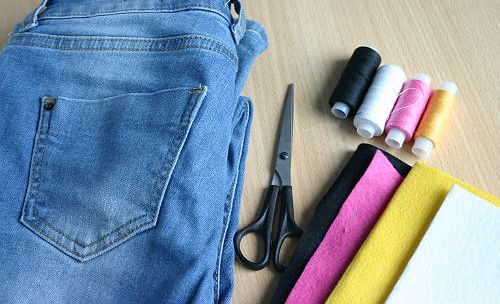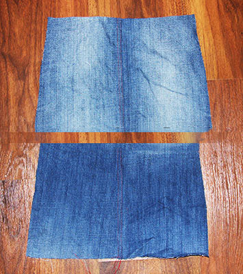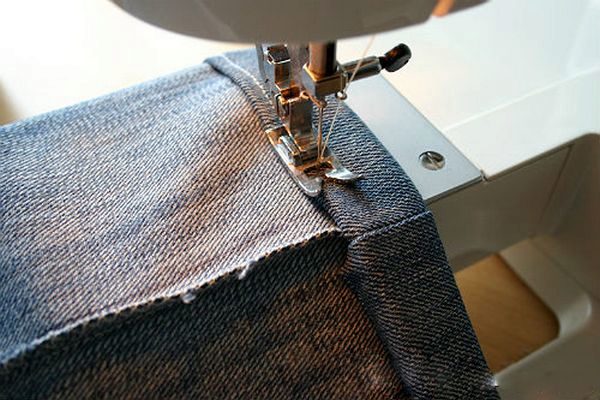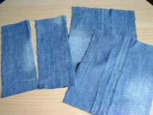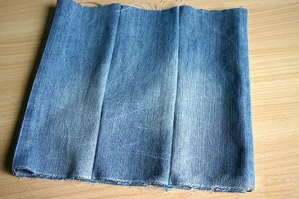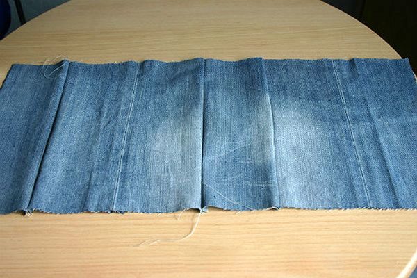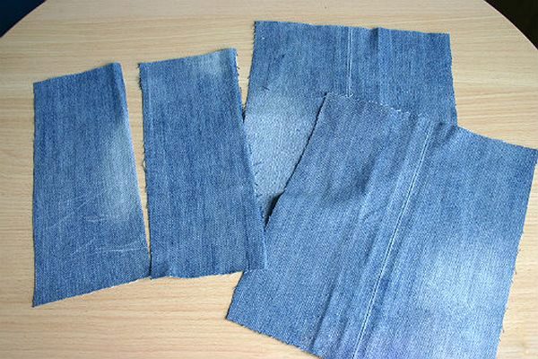 6 rectangles of size 30 * 15 cm are cut out of old jeans (additive for seams is taken into account) and are stitched. The edges of internal seams are better processed with a zigzag on a typewriter or processed on an overlock.