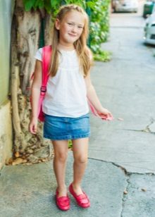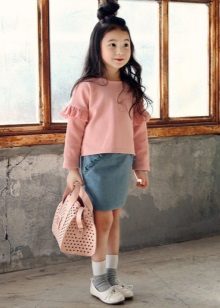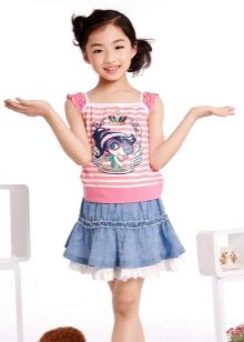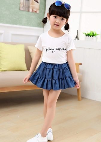As practice shows, denim skirt goes well with a t-shirt, with a blouse. A short denim jacket with white beads and a skirt matched to match it create the effect of an “adult” lady. Looks great bright shirt and light blue skirt.