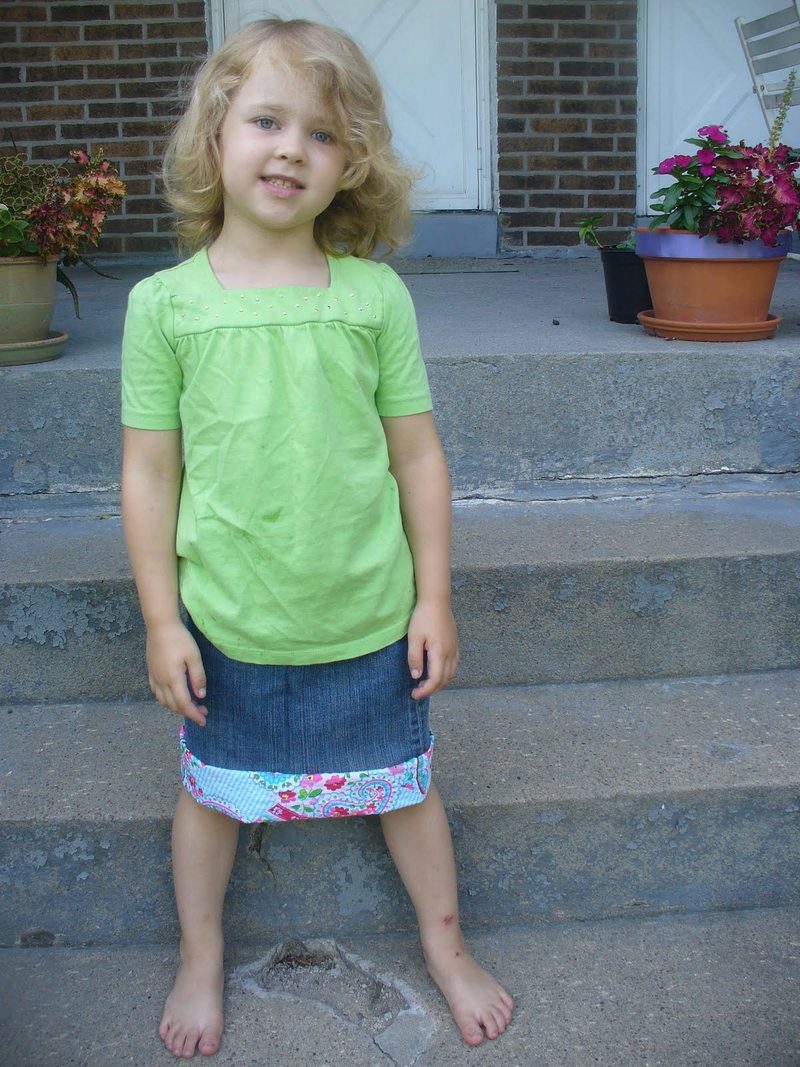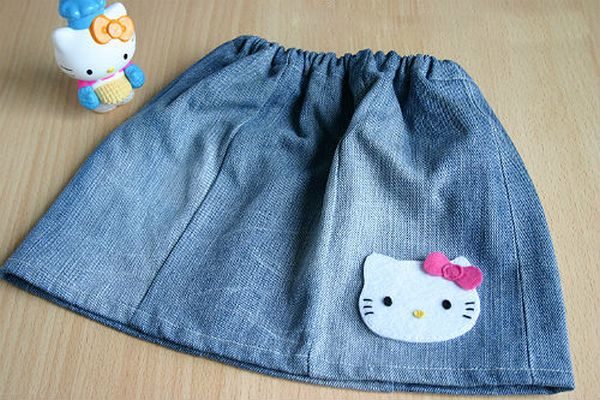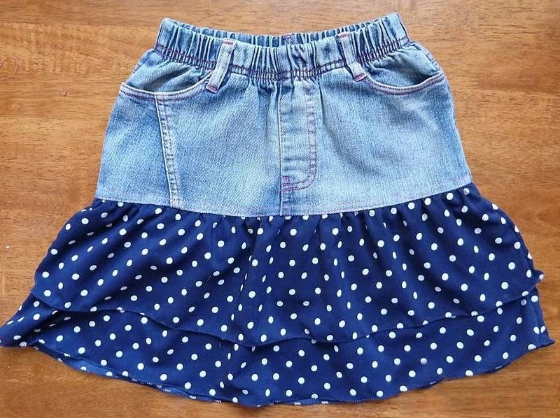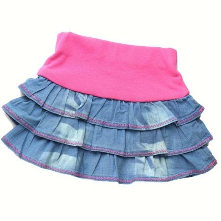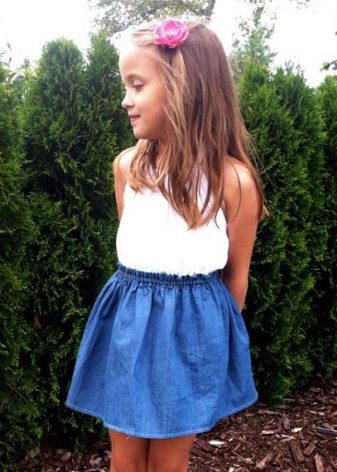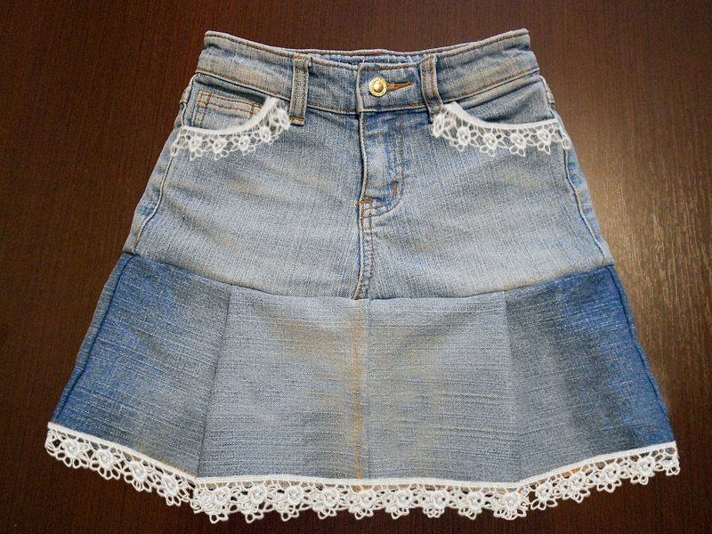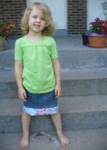 Experimenting at home will help old, not needed denim things. For example, if your girl has already grown out of the old skirt, but in the belt she is not yet small, then you can simply sew one wavy strip of suitable color. Or take a color summer matter, cut off strips of different lengths, finish sewing - here is a new skirt. And another option is to crochet a piece of the desired length to a straight skirt, and the product looks both monophonic and from combined threads.