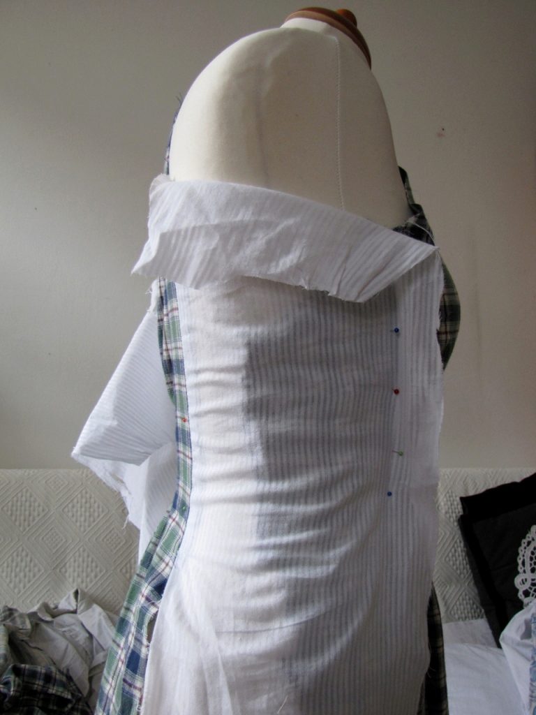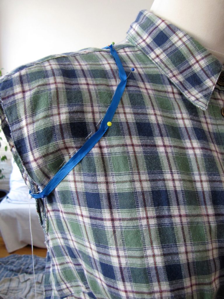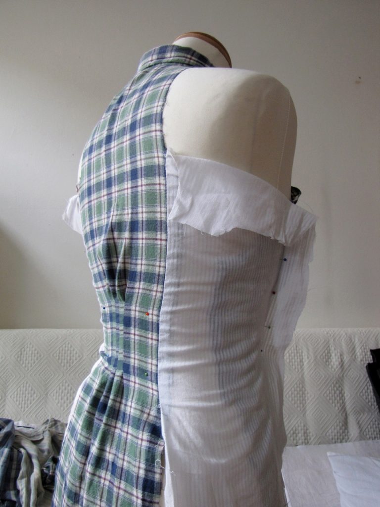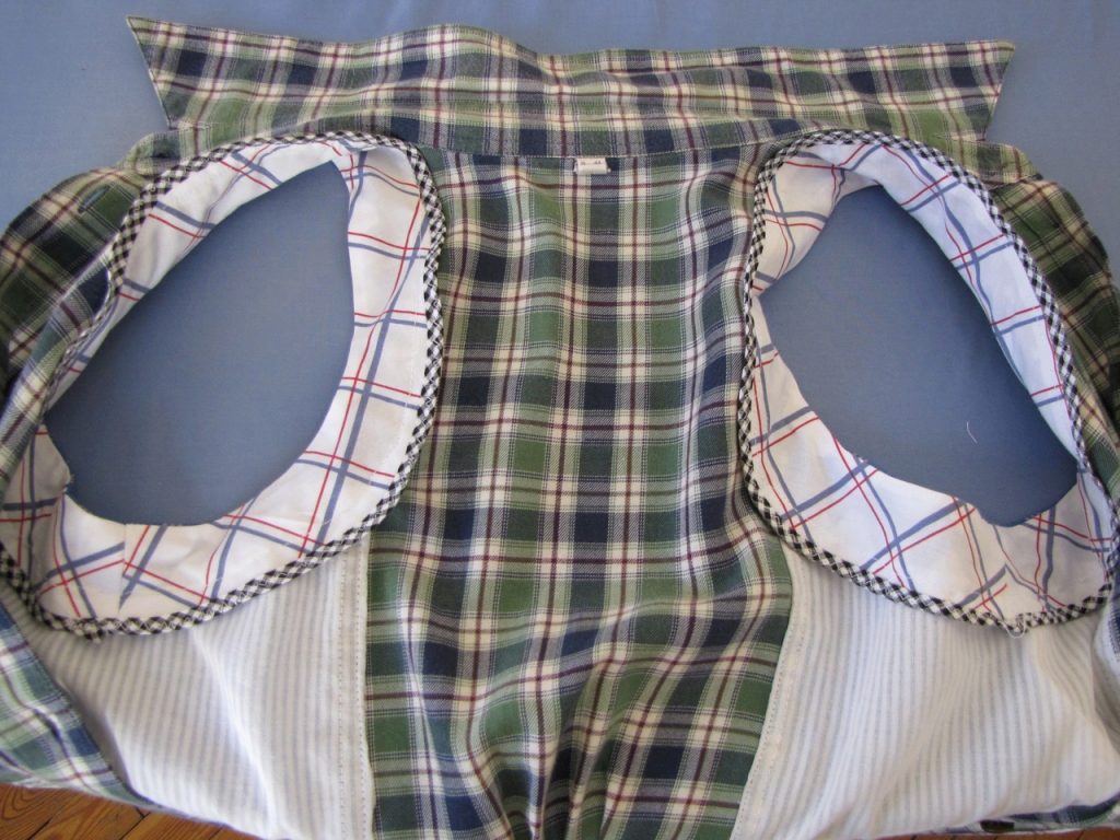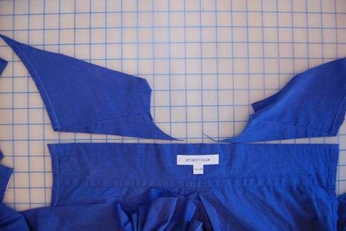 Sew the top of the dress together. Dig out and sew armhole facing, attaching the finished top to one of the shirts.