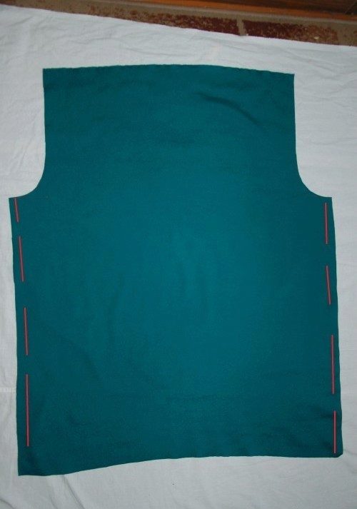 In the center of the rectangle, draw a conditional line, where measure at the edges, for example, 35 cm for shoulders and 20 cm for the neck. In the right side, draw a triangular cut and cut the fabric, cut it.
