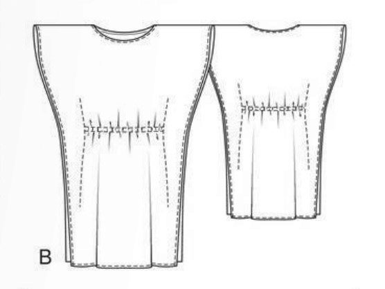- Cut one-piece front with facing and back with a bend, as well as 2 sleeves, facing for the neck and a belt 7 cm wide and 173-189 cm long.