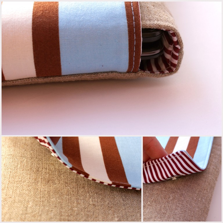 - The next step is to create a flap or bag cover. It is necessary to put the two parts face one another and flash them from 3 sides. The extra corners are cut, and the edges are processed, after which the valve should be turned to the front and do it all again. When the flap is smoothed, a decorative line should be laid on the front side along the perimeter. Now you can insert buttons on the magnets. After that, the valve is applied to the front back of the product and can be fastened with pins. To do this, you need to fold the main part and lining, then sew them. Now sew the hole that was left in the gasket and the bag will be ready.