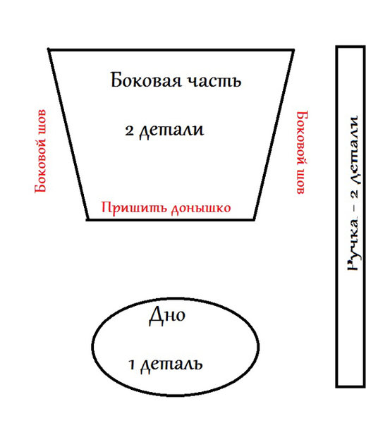 - In the pattern of this model will need the following details: two semi-oval parts - front and rear walls, a long rectangular part - for connecting these parts, two rectangular parts - for the manufacture of handles. You can complement the model with a small decorative pocket sewn on the front.